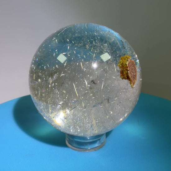 This stunning Rutile Quartz Sphere is a treasure for any collector or lover of luxury. Its rare golden rutile inclusions make it an exquisite addition to any display. The mesmerizing garden Quartz adds a touch of natural beauty to this already gorgeous piece.