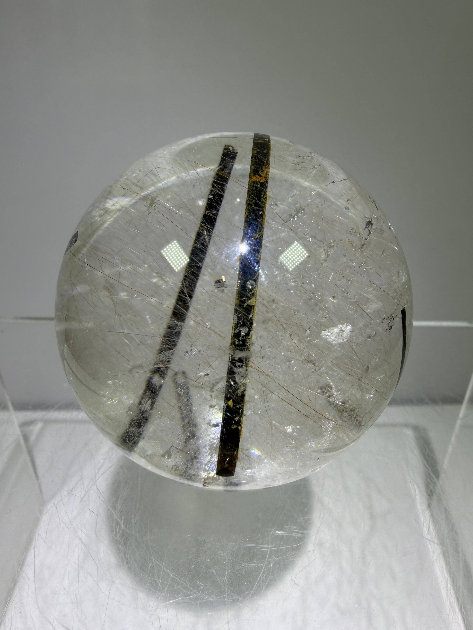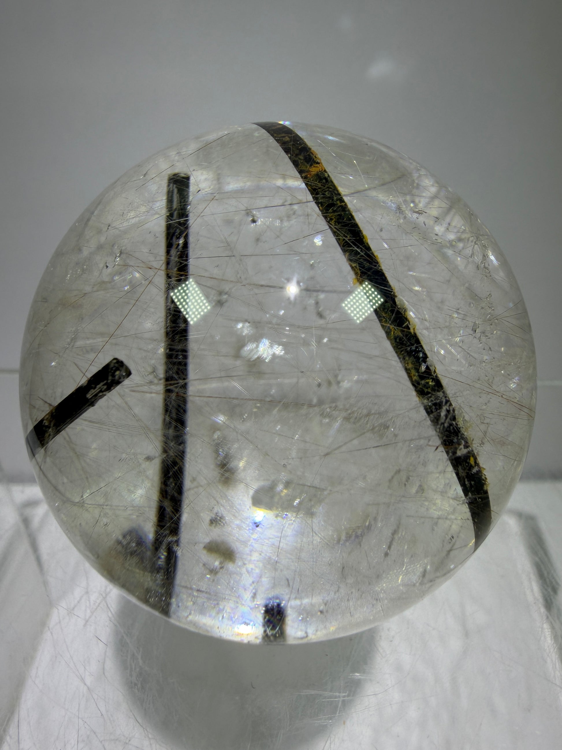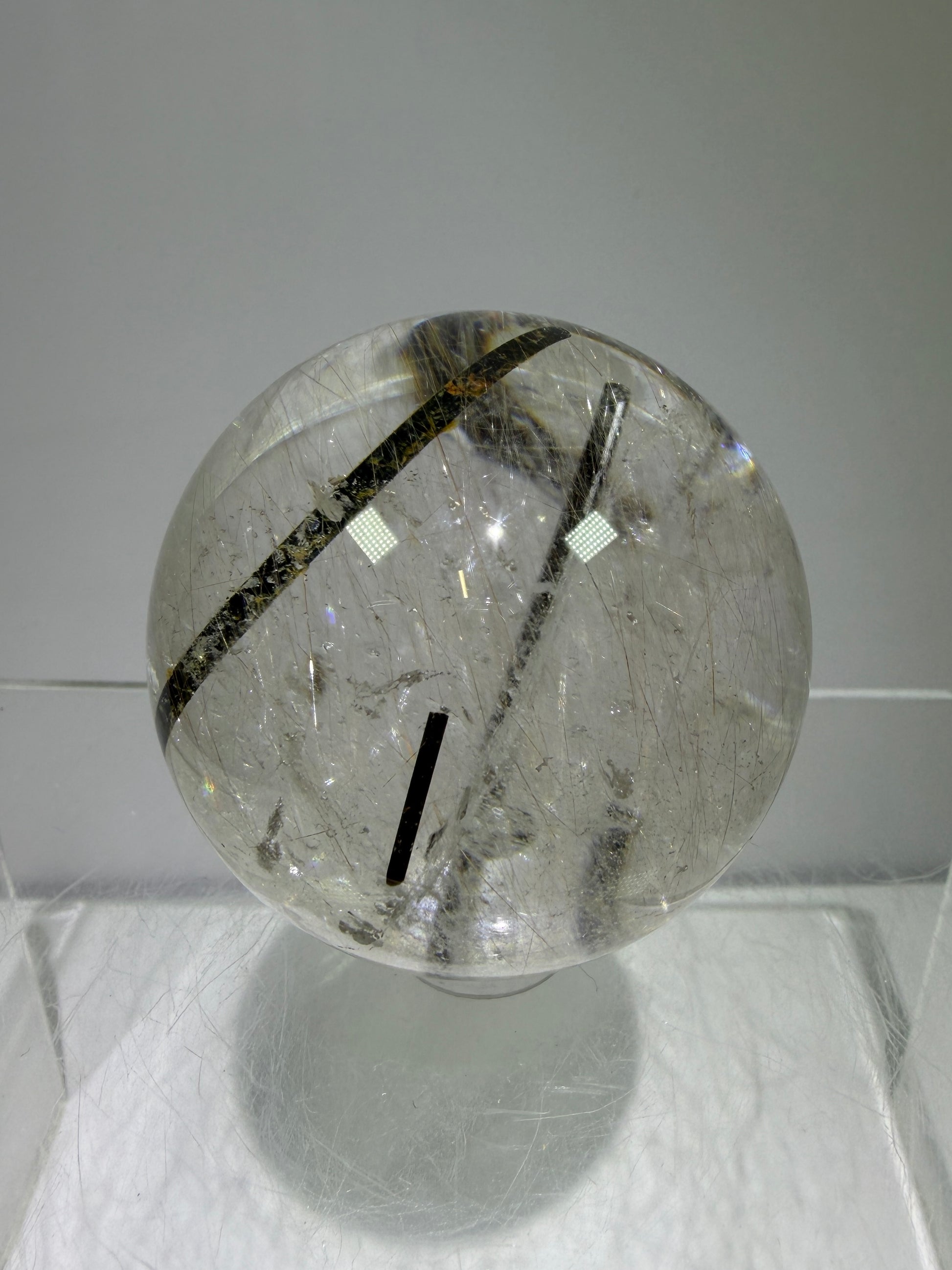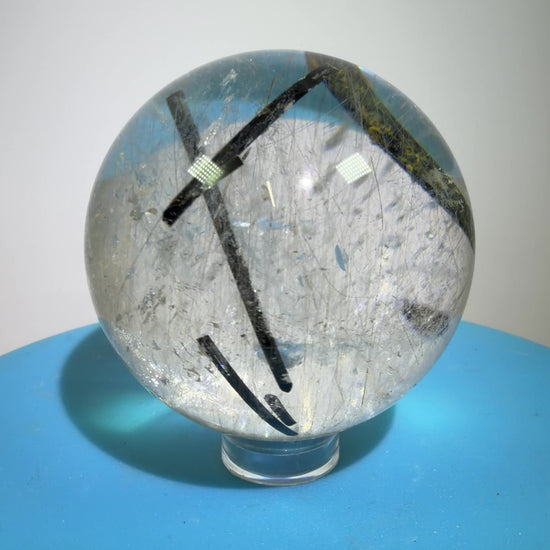 This Rutile Quartz Sphere, measuring 49mm, features a rare combination of gold and silver rutile inclusions interspersed with black tourmaline. This high-quality sphere exhibits excellent clarity, making it an exceptional specimen for collectors and enthusiasts alike, showcasing unique mineral inclusions that enhance its aesthetic and educational value.