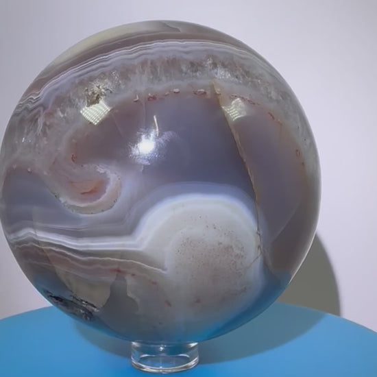 Beautiful hand carved Sashe Agate sphere from Zimbabwe. Small natural druzy spots. Agate nodules from the Sashe River in Zimbabwe, are renowned for rich blue and pink colors with some pieces having crystalline centers. The Agate from this region is 100% natural in color and no treatment of any nature is used to enhance the coloration. The nodules also tend to have complex banded and stunning patterns with occasional white to cream colored layers in some instances. This is a rare material which is not often worked.
