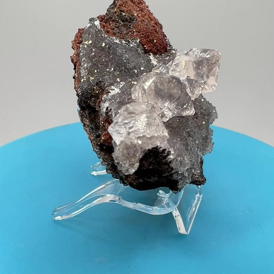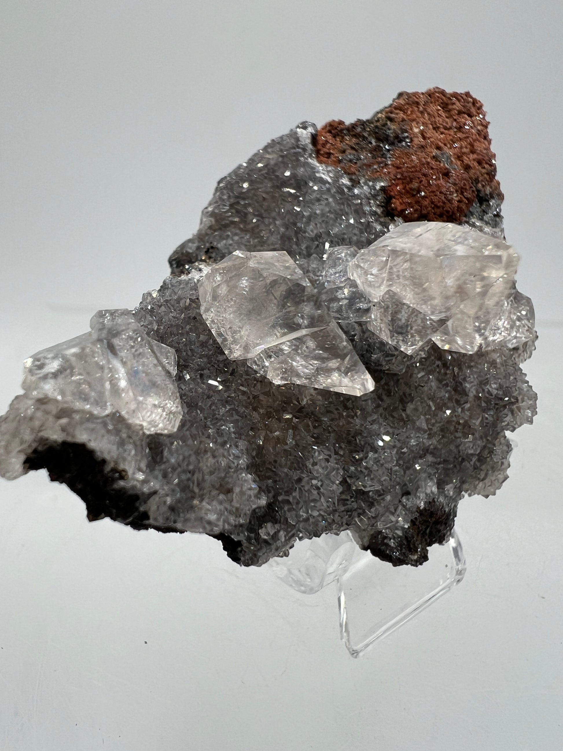 This Silver, Black, and Red Diamond Calcite specimen from the Potosi mine in Santa Eulalia, Chihuahua Mexico is a stunning addition to any crystal collection. Its flashy appearance and beautiful cluster on matrix make it a very cool display piece.