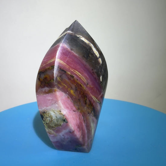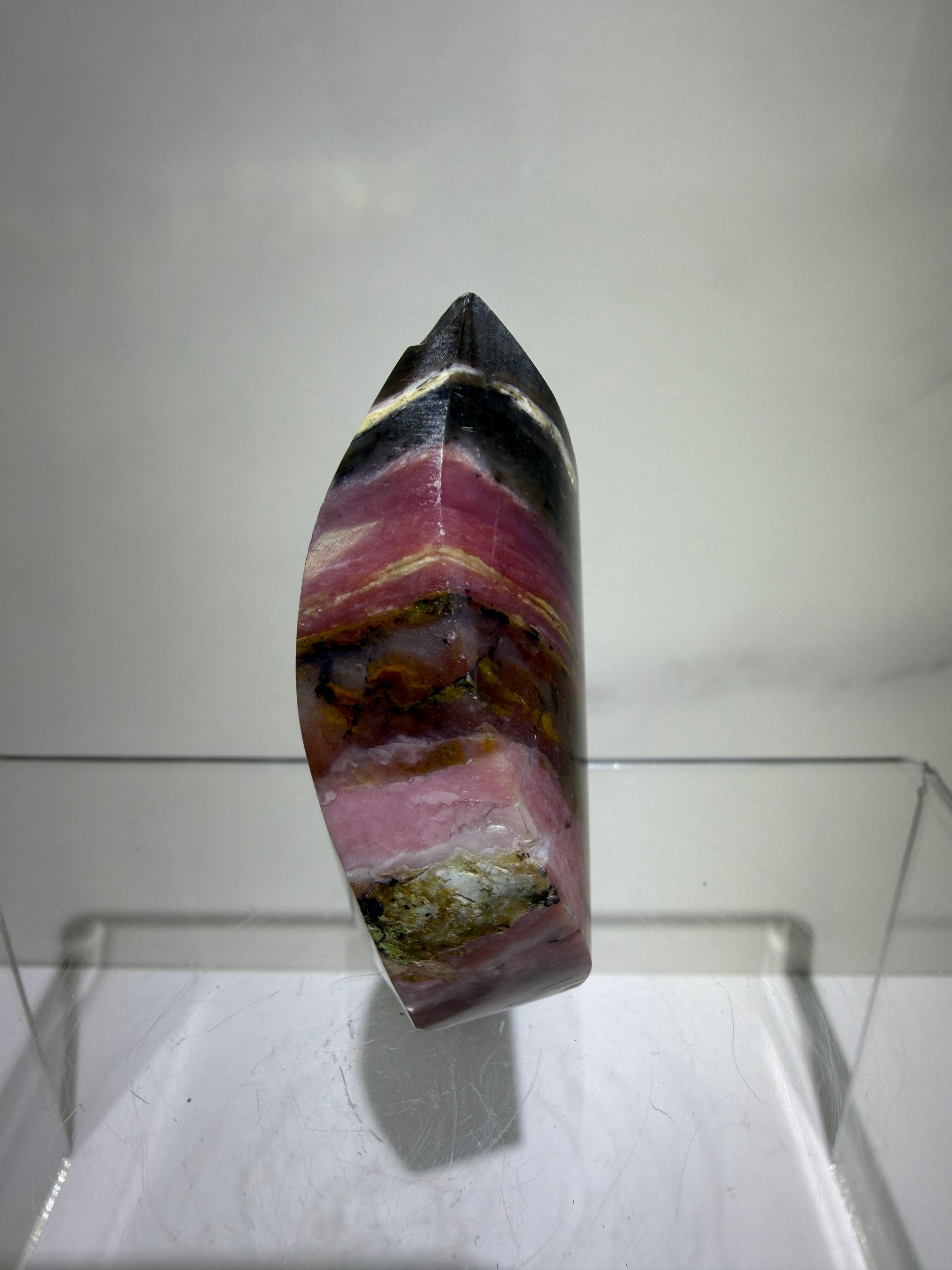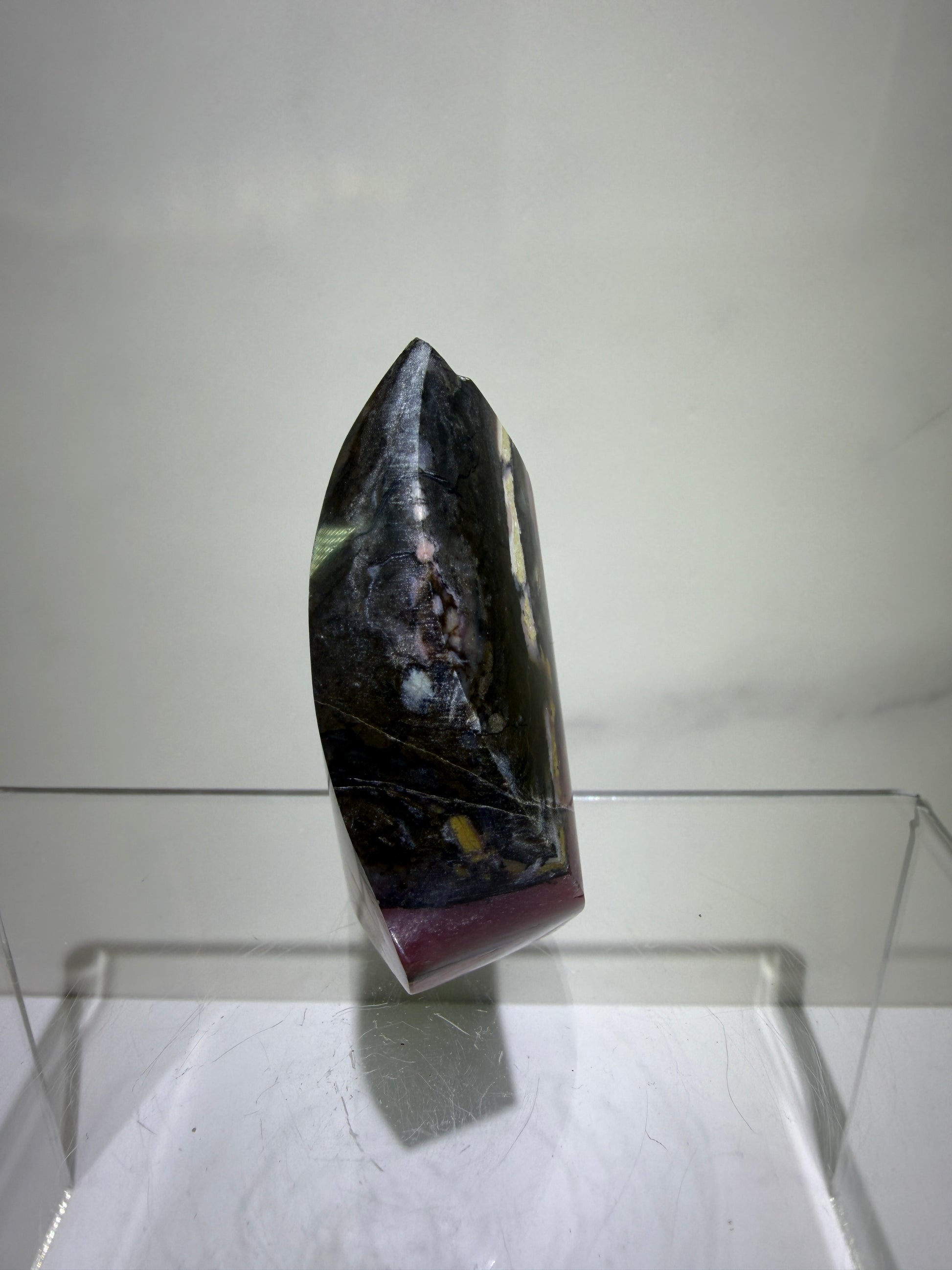 Gorgeous strawberry pink opal flame. A recent discovery of pink opal from the Andes mountains in Peru. Stunning shades of pink and purple. Small natural druzy spot on the rear of the point. Beautiful rare addition to any collection.