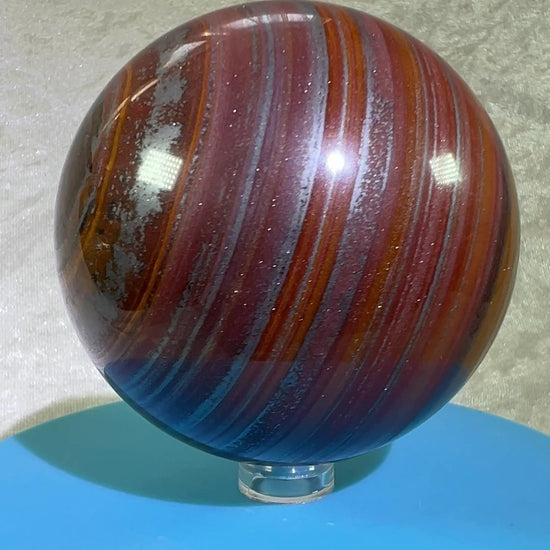 This Tiger Iron Crystal Sphere is a rare, high-quality display sphere. Combining tigers eye, red jasper, and hematite, this unique sphere offers amazing flashes of color and a one-of-a-kind addition to your crystal collection. Don't miss out on this uncommon and visually stunning piece.