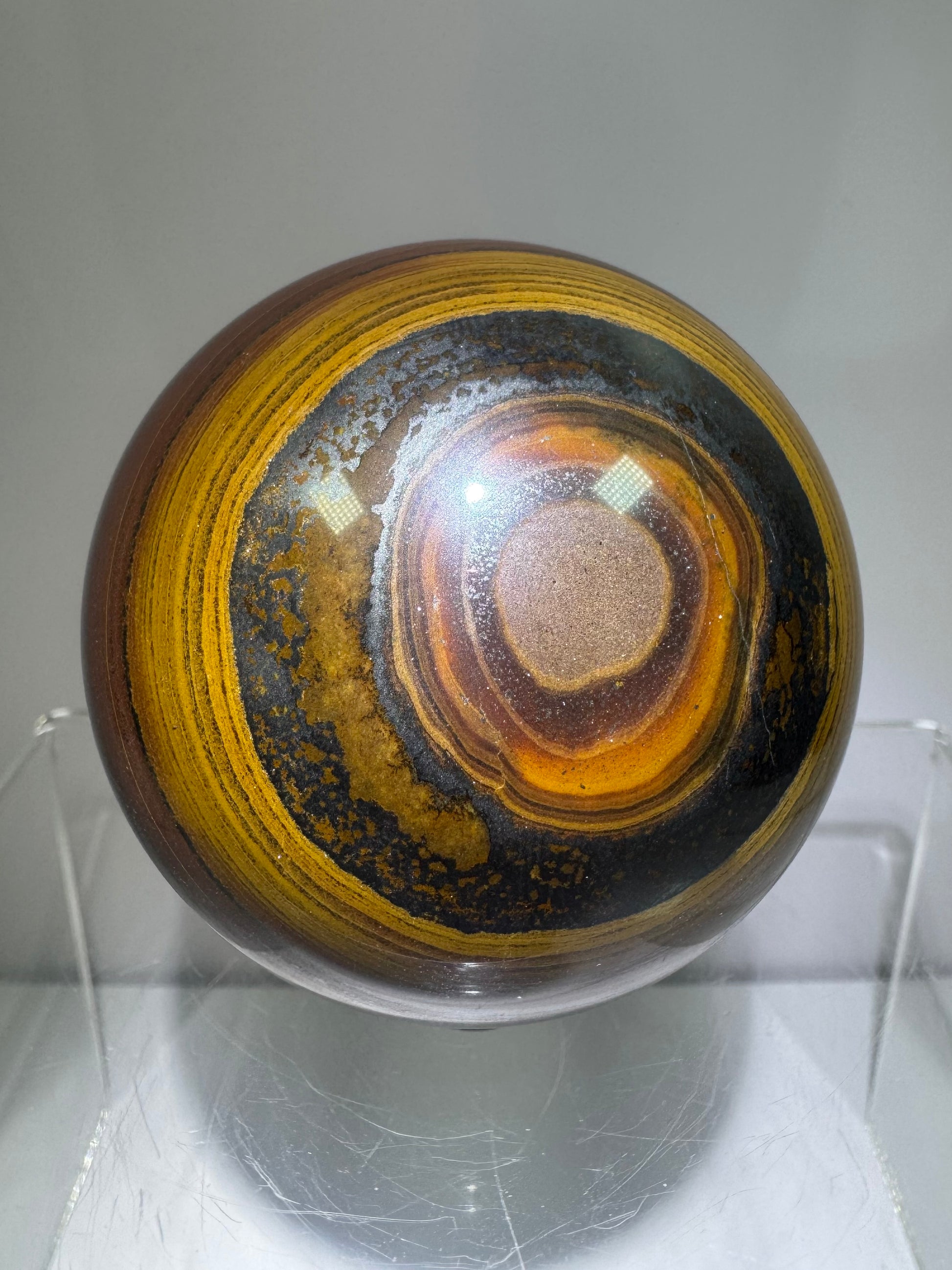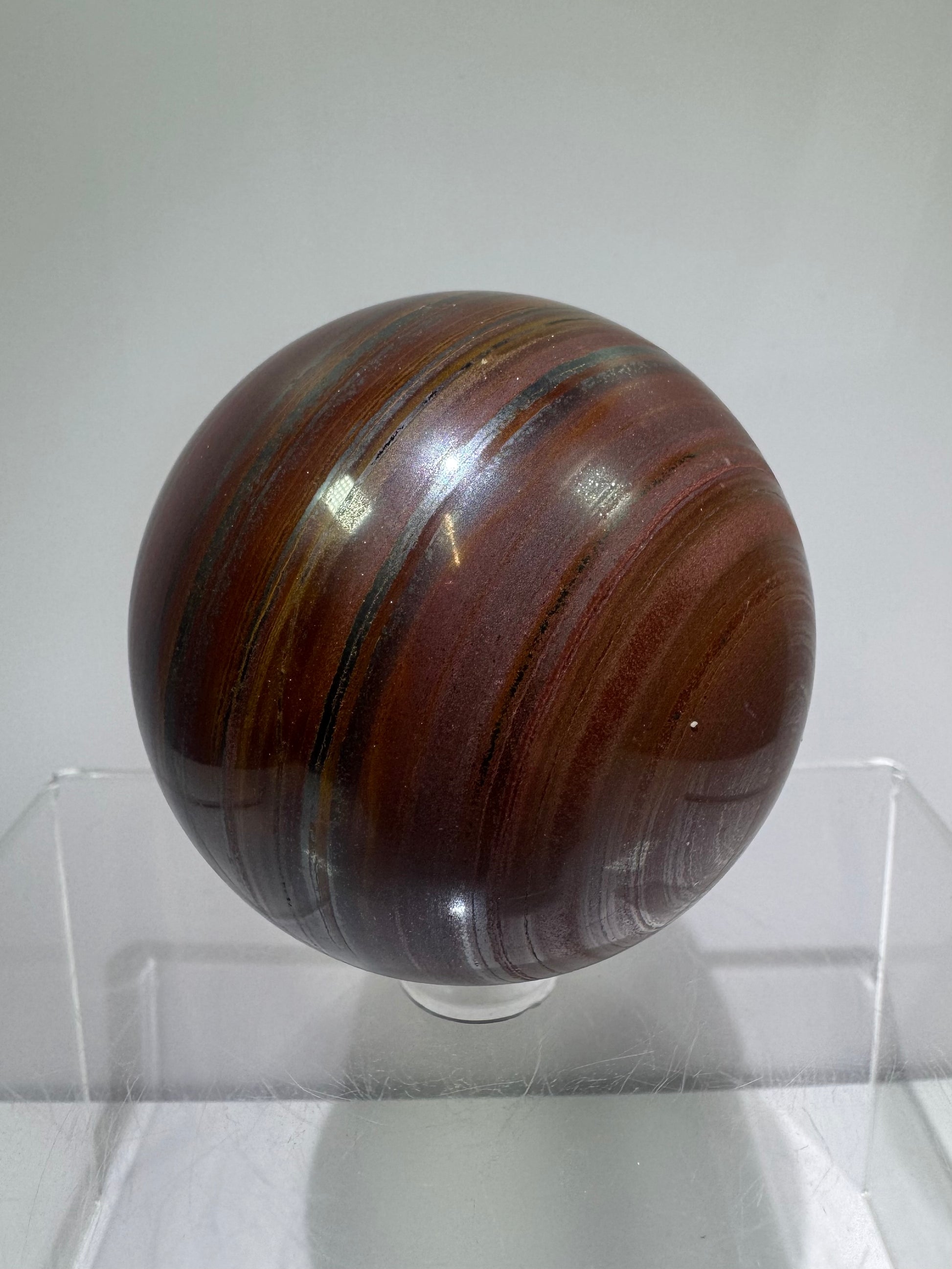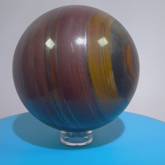 This Tiger Iron Crystal Sphere is a rare, high-quality display sphere. Combining tigers eye, red jasper, and hematite, this unique sphere offers amazing flashes of color and a one-of-a-kind addition to your crystal collection. Much more hematite in this sphere, causing darker unique colors. Don't miss out on this uncommon and visually stunning piece.