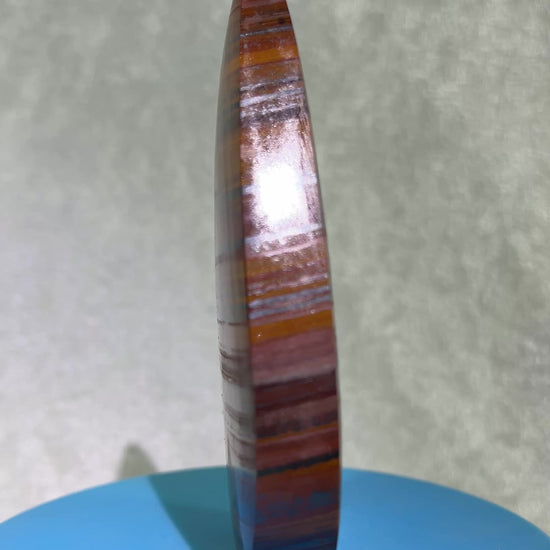 This Tiger Iron Crystal flame is a rare display crystal. Combining tigers eye, red jasper, and hematite, this unique flame offers amazing flashes of color and a one-of-a-kind addition to your crystal collection. Don't miss out on this uncommon and visually stunning piece.