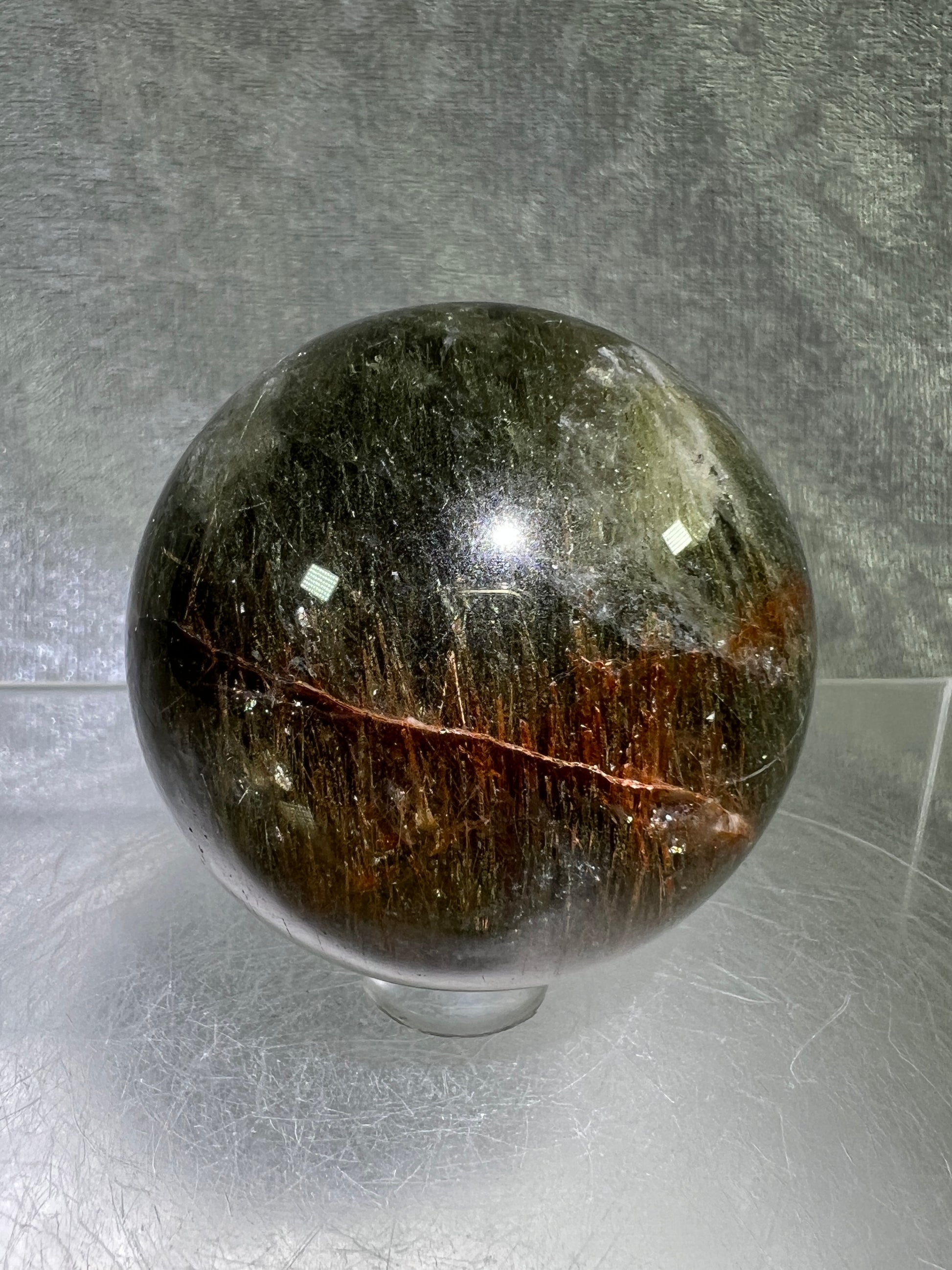 Tourmalinated Quartz Sphere. 52mm. Gorgeous Red And Green Tourmaline Inclusions. Rare And Unique Display Sphere.