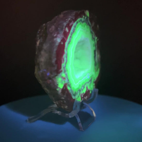 This Trancas crystal geode half from Chihuahua, Mexico is a true treasure. Found inside rhyolite boulders, this geode boasts a beautiful druzy interior that lights up under shortwave UV light. It will only react to a shortwave 255nm UV light. And with excellent UV reaction, it's a must-have for any crystal collector or lover of unique geological formations. Small clear display stand is included.