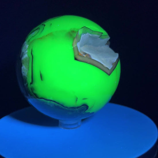Unleash the thrill-seeker within with our Volcano Agate Sphere! This 71mm sphere features an intense green UV reaction and stunning blue druzy, making this truly one-of-a-kind. Get ready for an adventure with this high-quality, unique agate.