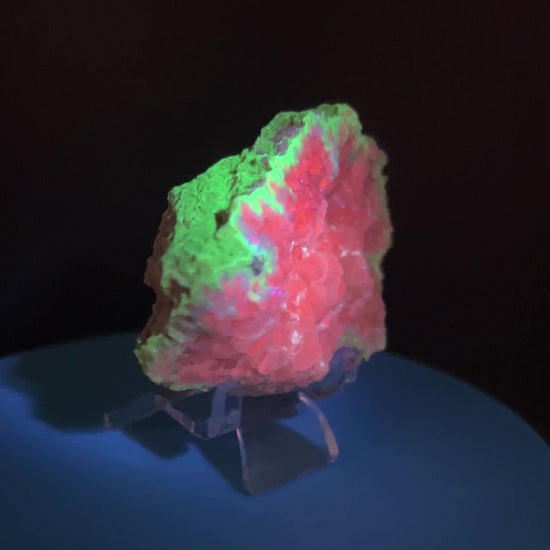 This rare Watermelon Calcite specimen from La Patagonia, Argentina promises to be a stunning addition to any collection. Featuring a high quality intense UV reaction, this gorgeous crystal will be sure to impress. A new discovery that is not to be missed by any collector. With a longwave UV light you will only get an orange reaction on the calcite. For the full watermelon colors you will need a shortwave 255nm UV light.