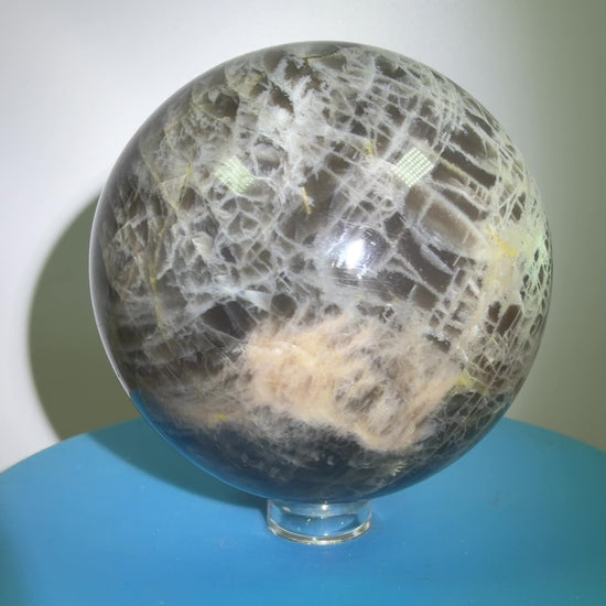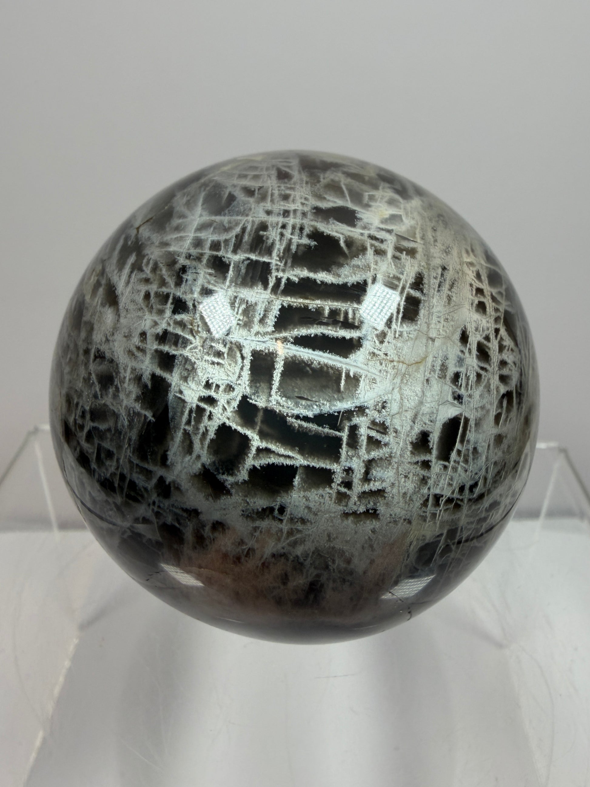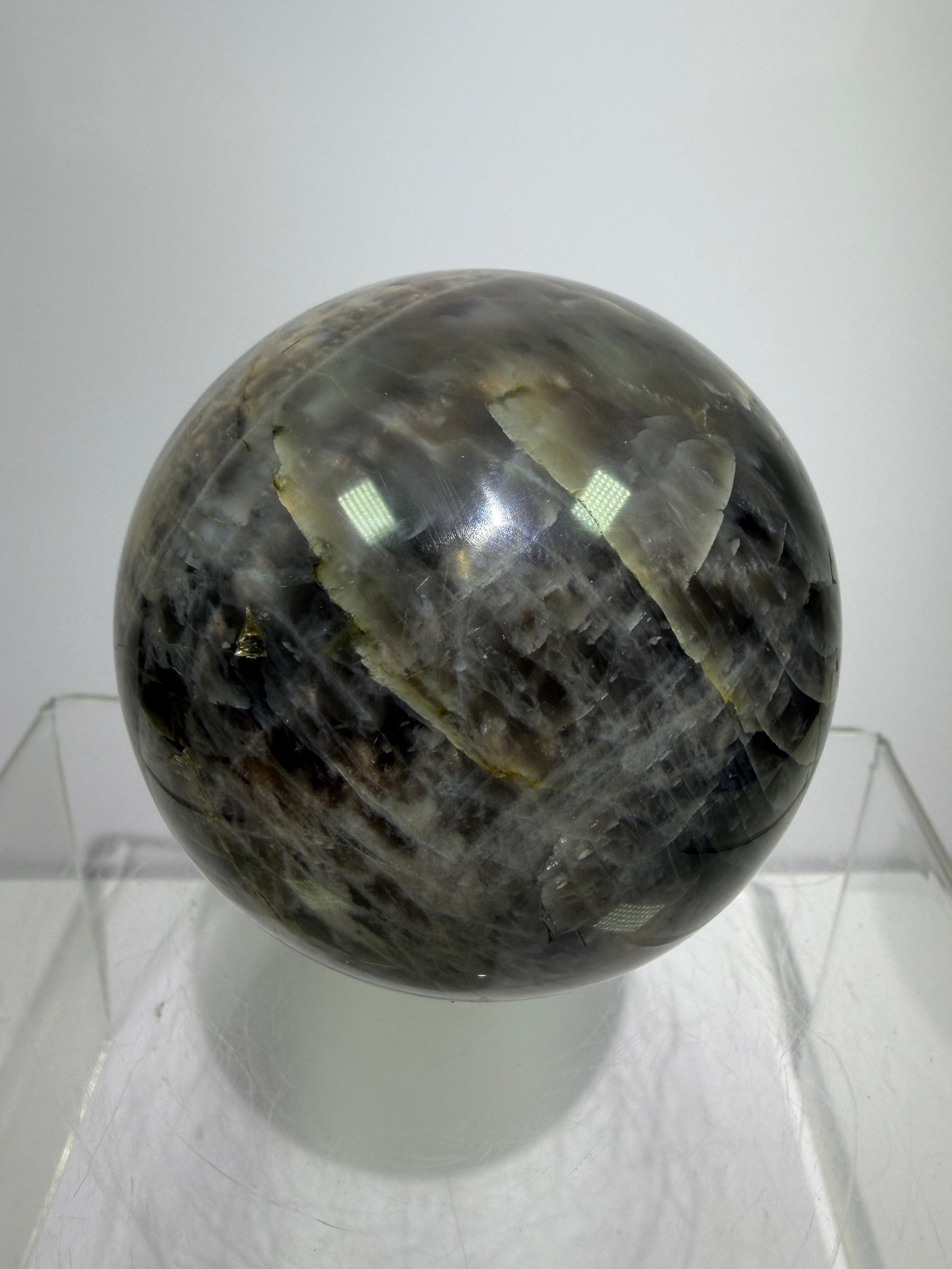 Black Moonstone Crystal Sphere. 66mm. Stunning Bright Silver Flash. High Quality Display Sphere