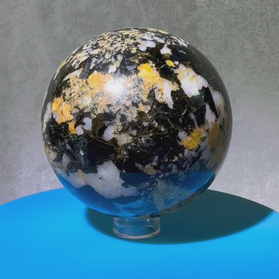Yellow Tourmaline And Black Mica Sphere. 62mm. Rare New Discovery. Stunning And Flashy Display Sphere.