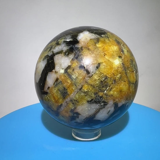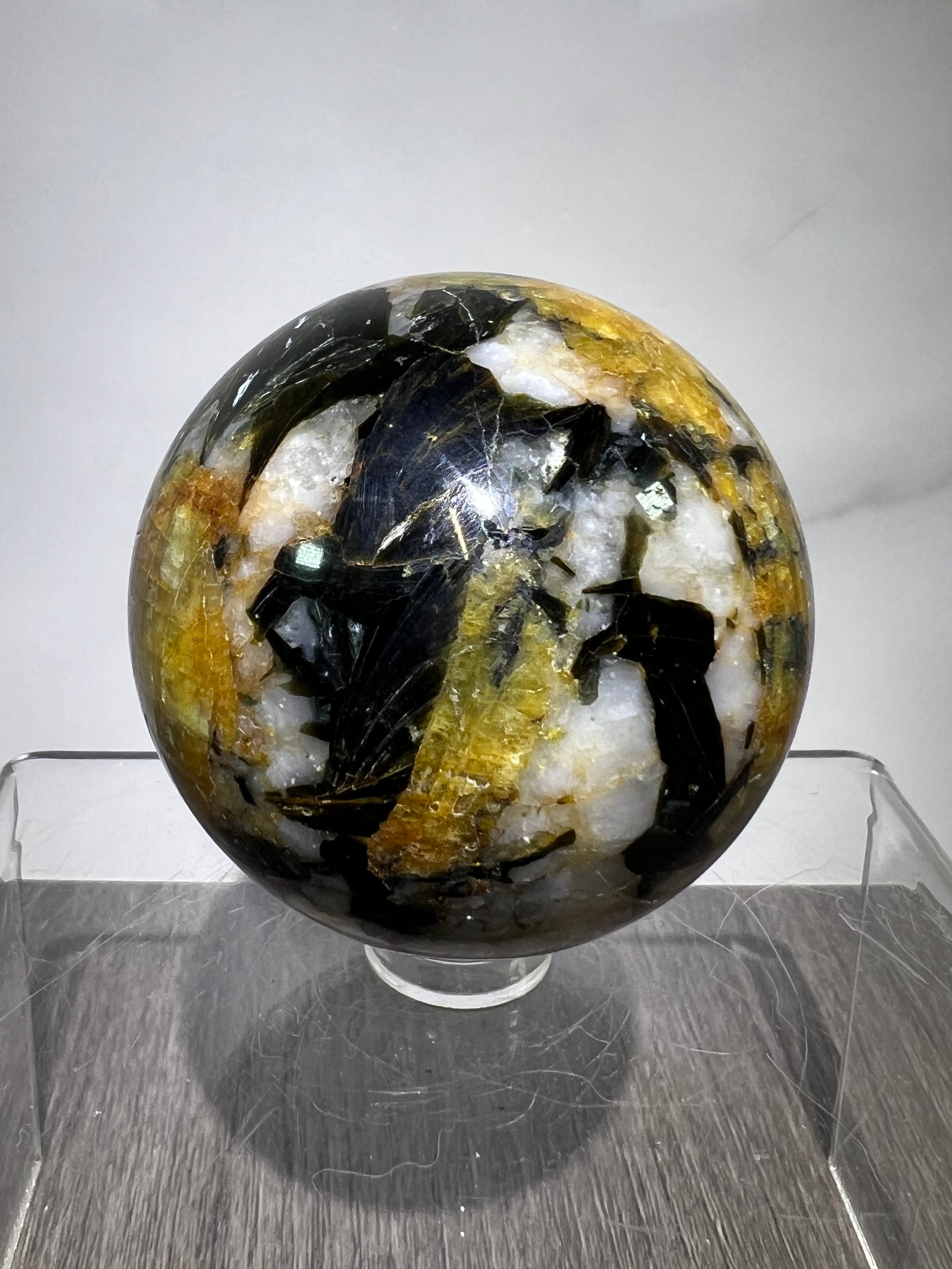 Yellow Tourmaline And Black Mica Sphere. 54mm. Rare New Discovery. Stunning And Flashy Display Sphere.