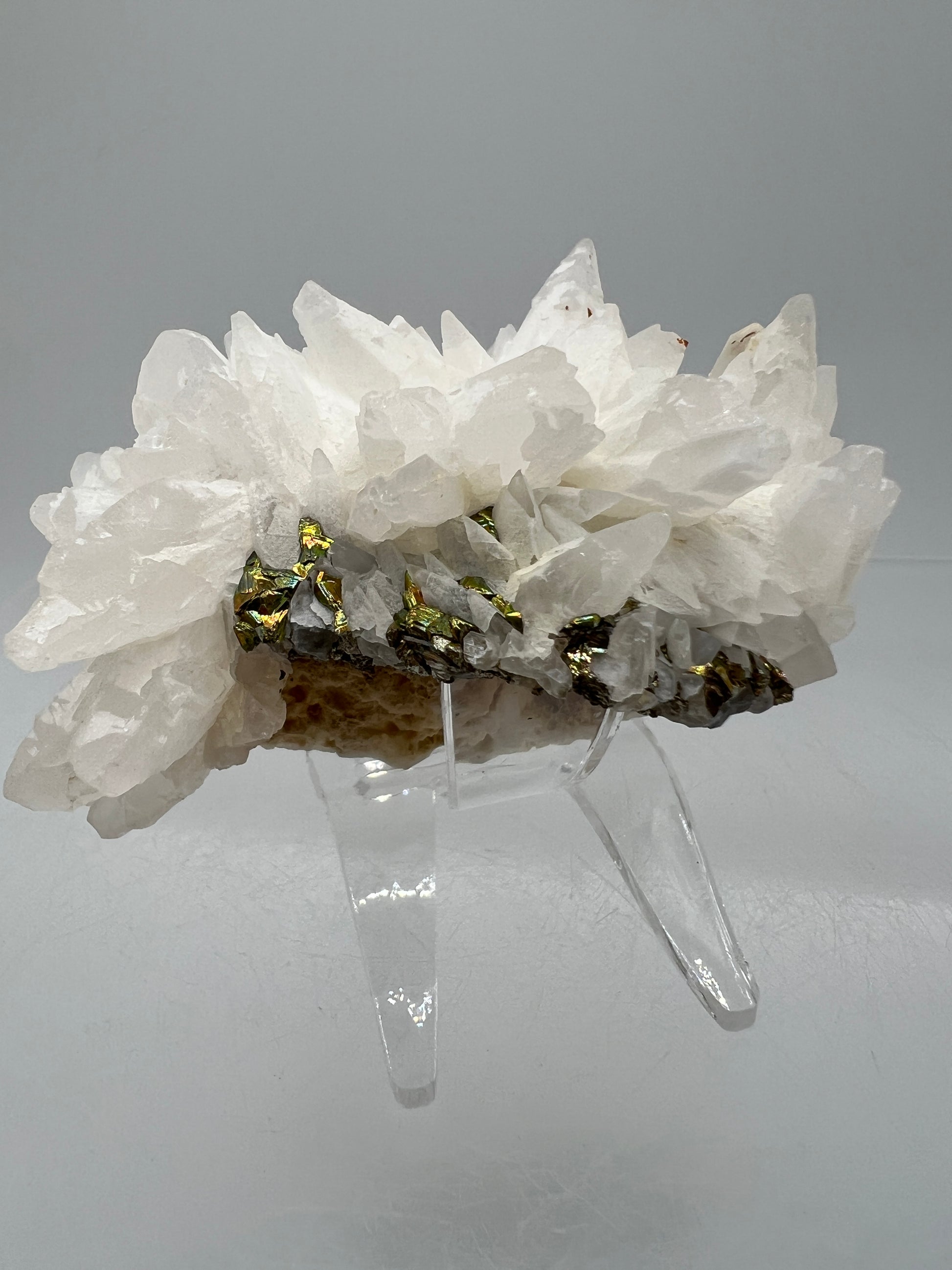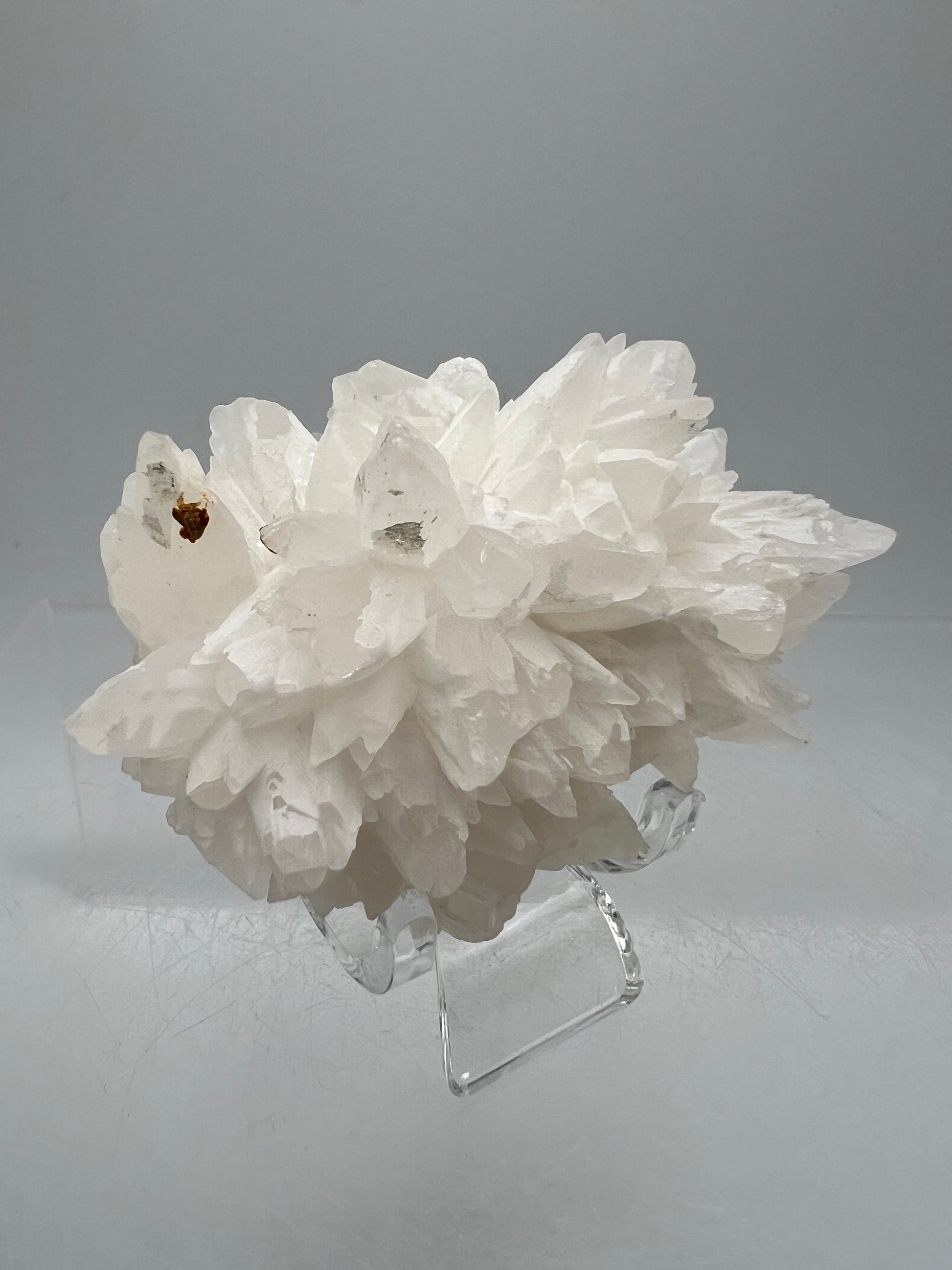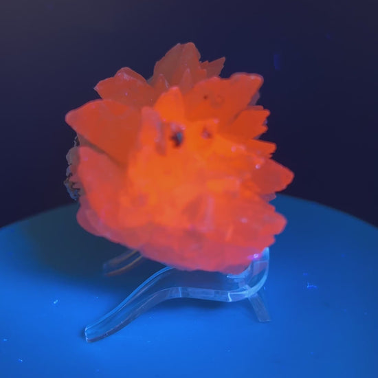 This stunning specimen features dogtooth mangano calcite and marcasite crystals from Guerrero, Mexico. Under a UV light, the bright orange reaction is truly amazing. This specimen is a must-have for any crystal collector, adding a unique and eye-catching display piece to your collection. Small clear display stand is included.