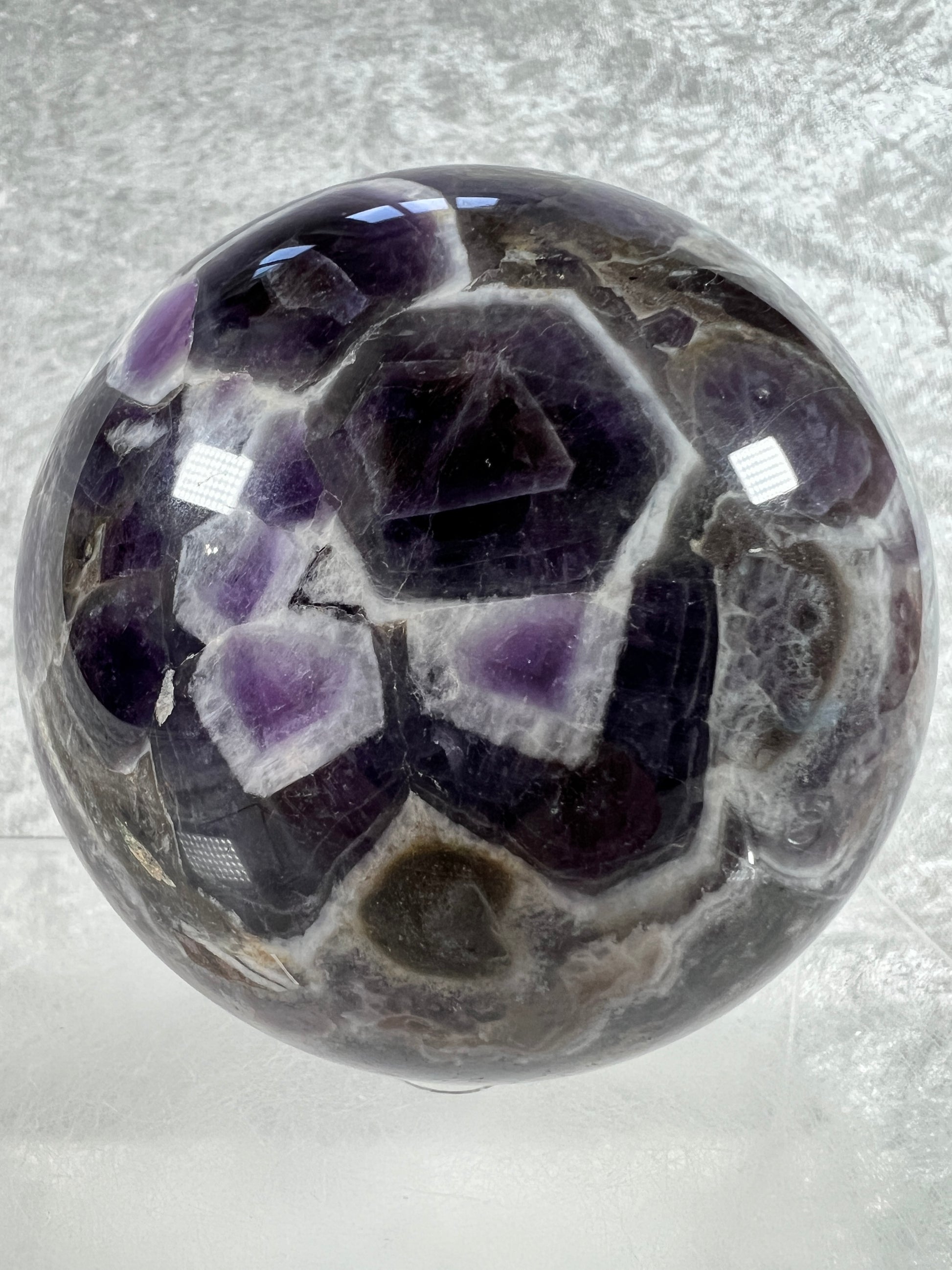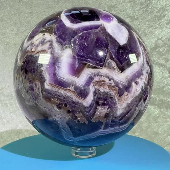 Let your imagination run wild with the Dream Amethyst Sphere. This large chevron amethyst crystal will mesmerize you with its unique patterns and vibrant colors. Perfect for meditation and dream work. Enhance your crystal collection with this stunning piece.