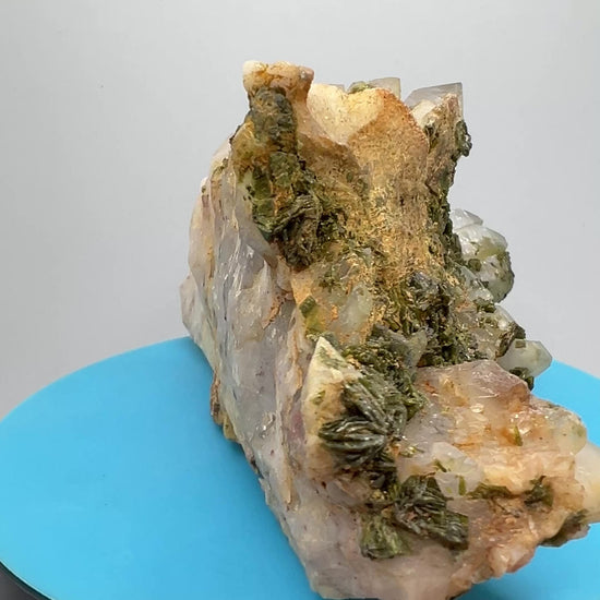 This stunning Epidote and Quartz specimen features beautiful peach colored inclusions, adding a unique touch to the mixed minerals in this nice cluster. A must-have for any collection, this specimen showcases the natural beauty of these two minerals.