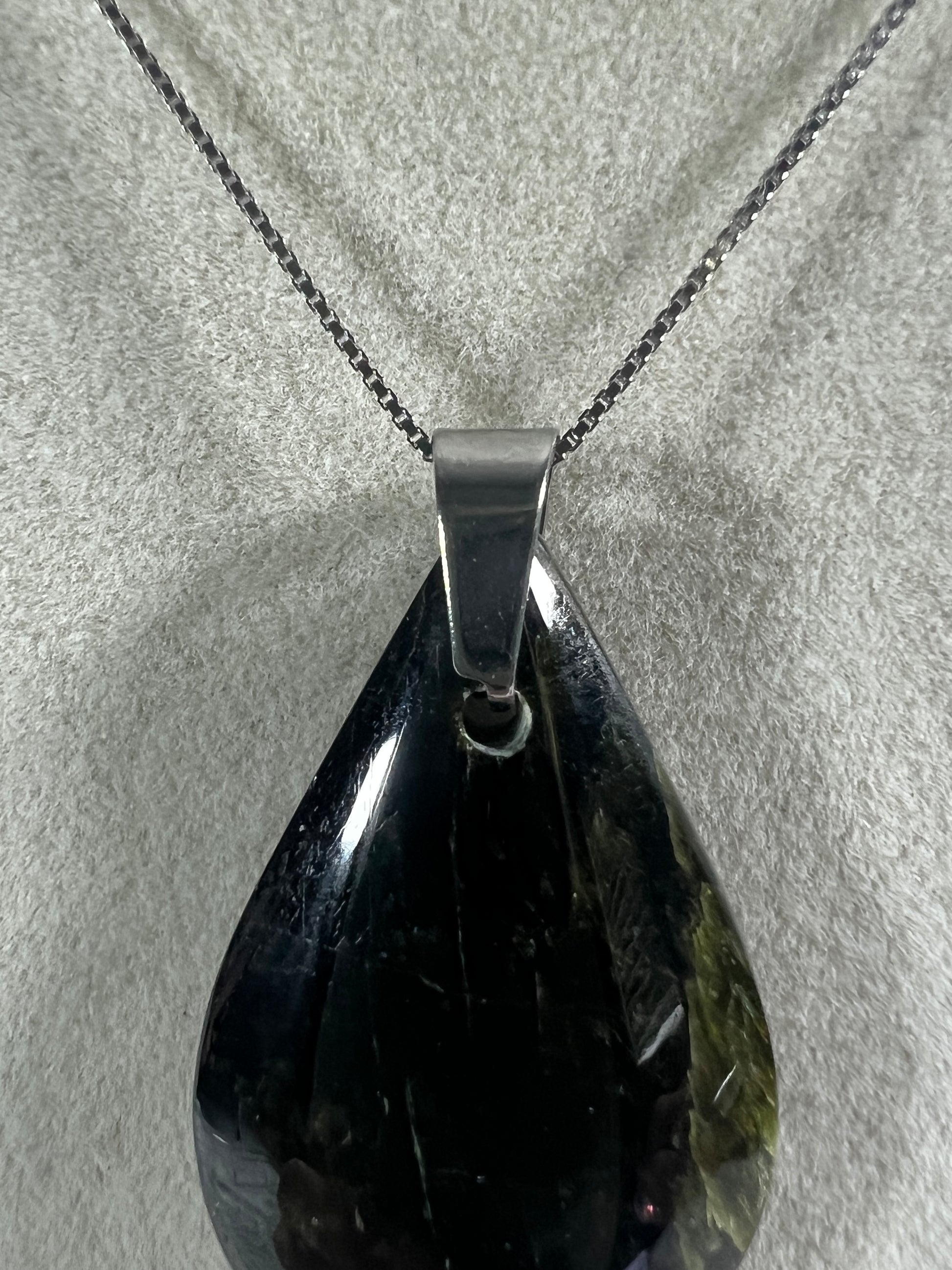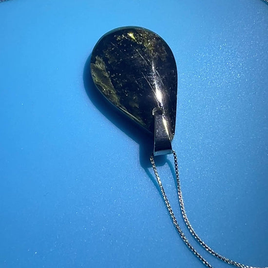 Stunning Epidote crystal pendant. Being cut from single big epidote crystals these fascinating and unique cabochons do surprise everyone with a sudden strong yellow flash. Gorgeous Crystal Jewelry from Peru. Also includes a high quality S925 silver 18 inch necklace. Don’t miss out on this rare and amazing crystal necklace.