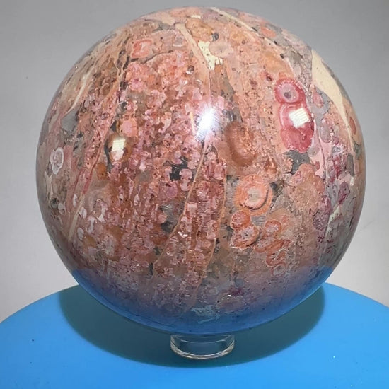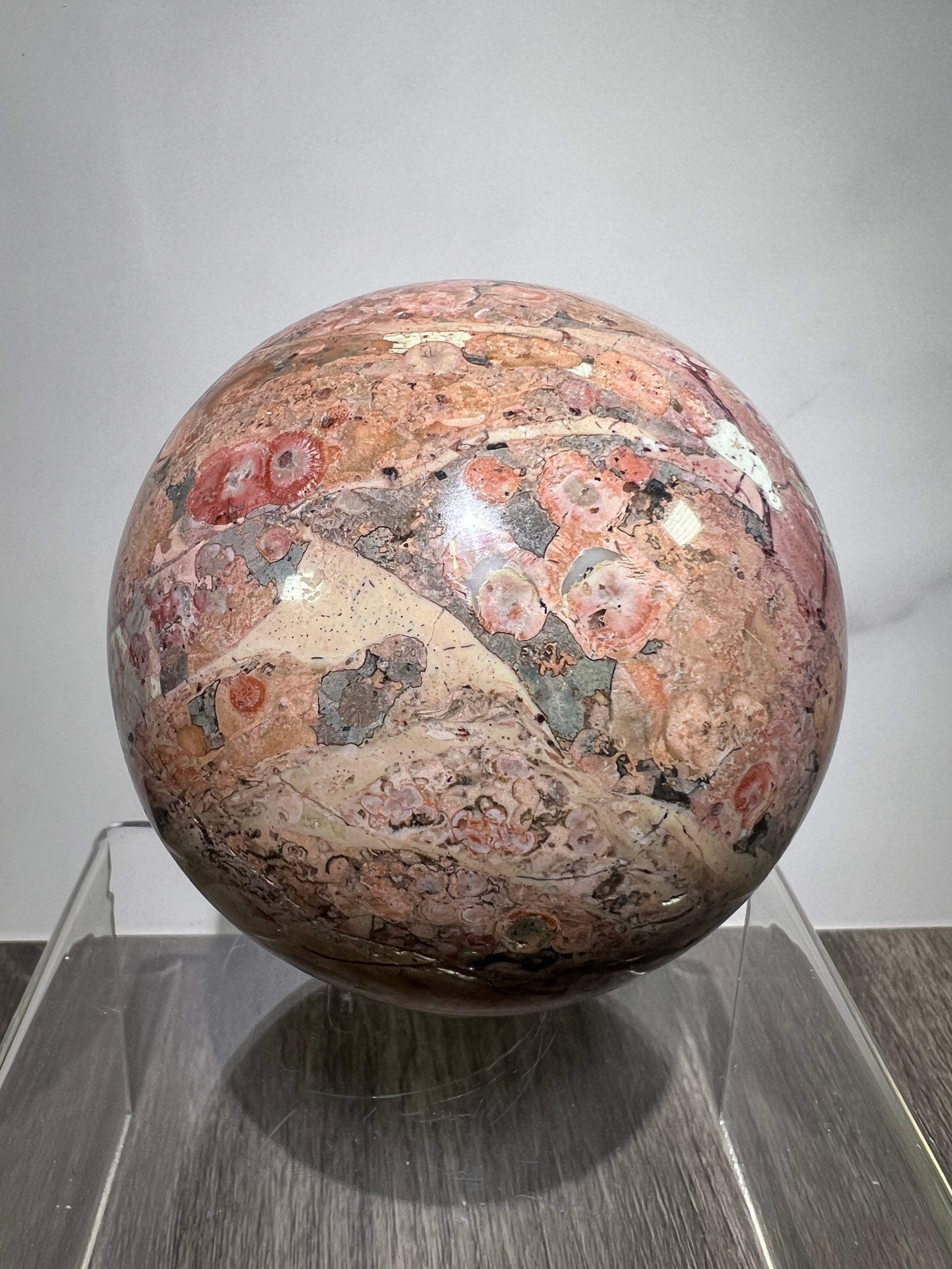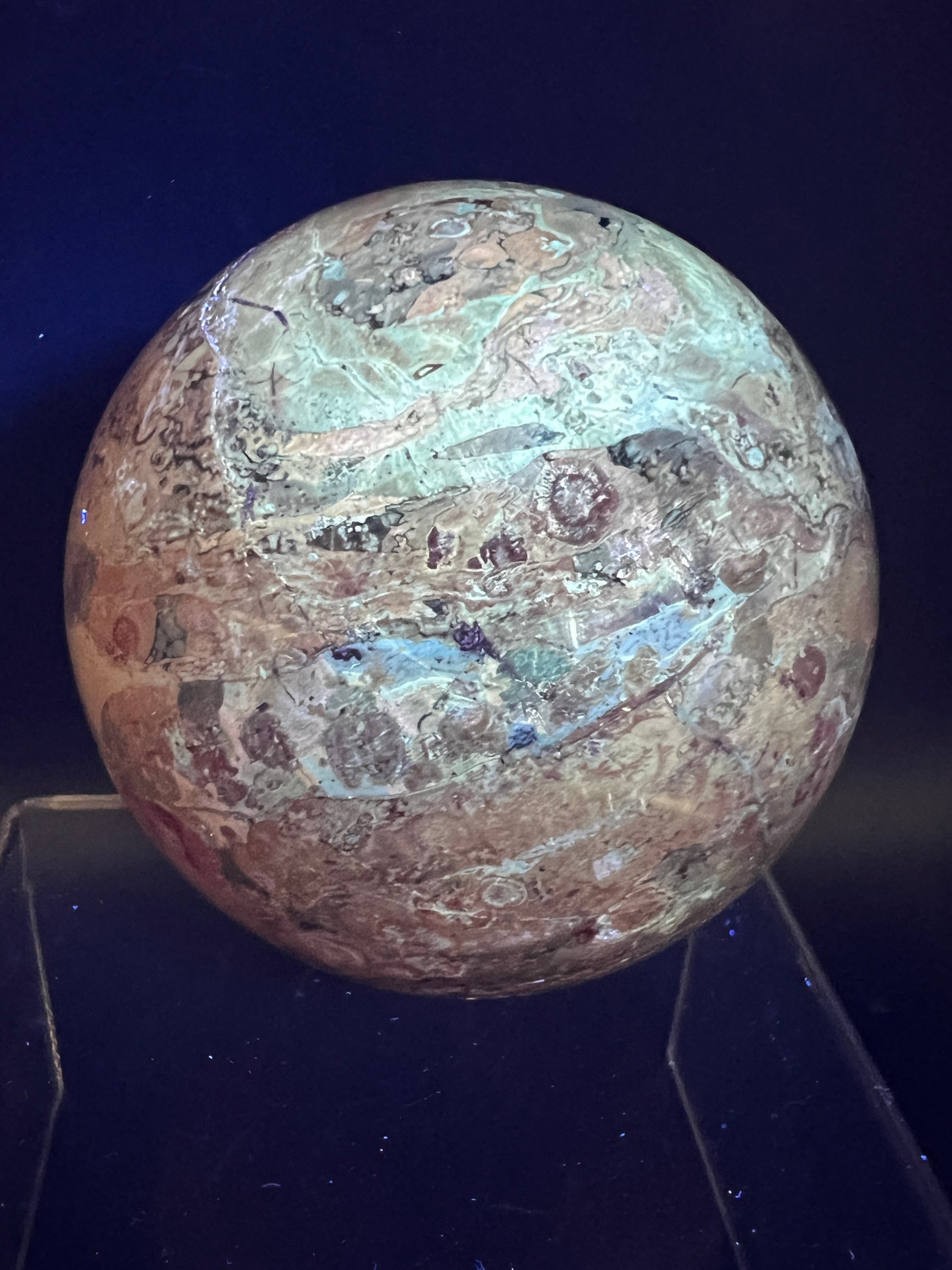 Beautiful new material found recently in a Mexican Obsidian mine. They are calling it Fire Calcite. Unique UV reaction from the calcite and bright spots from common opal mixed with the material. Amazing colors with incredible patterns. Very cool new addition to your collection. One of a kind display sphere.
