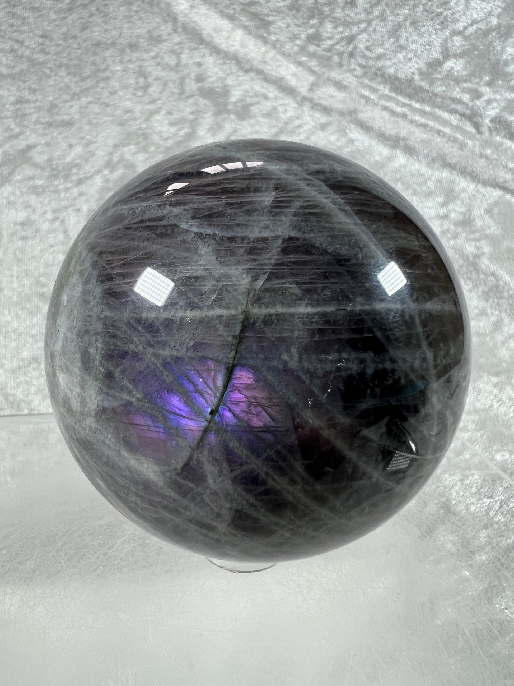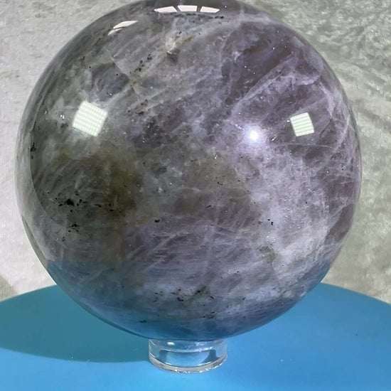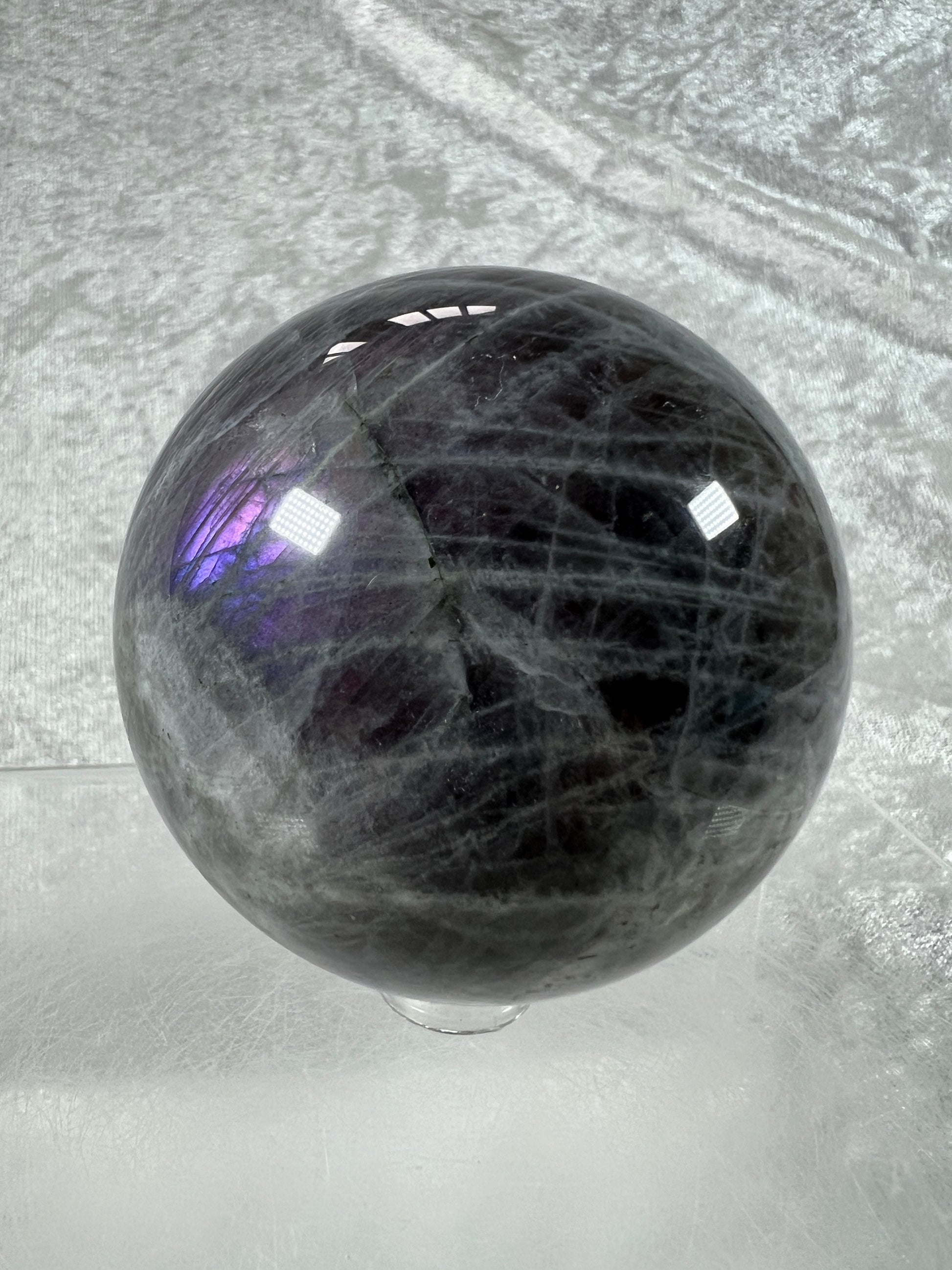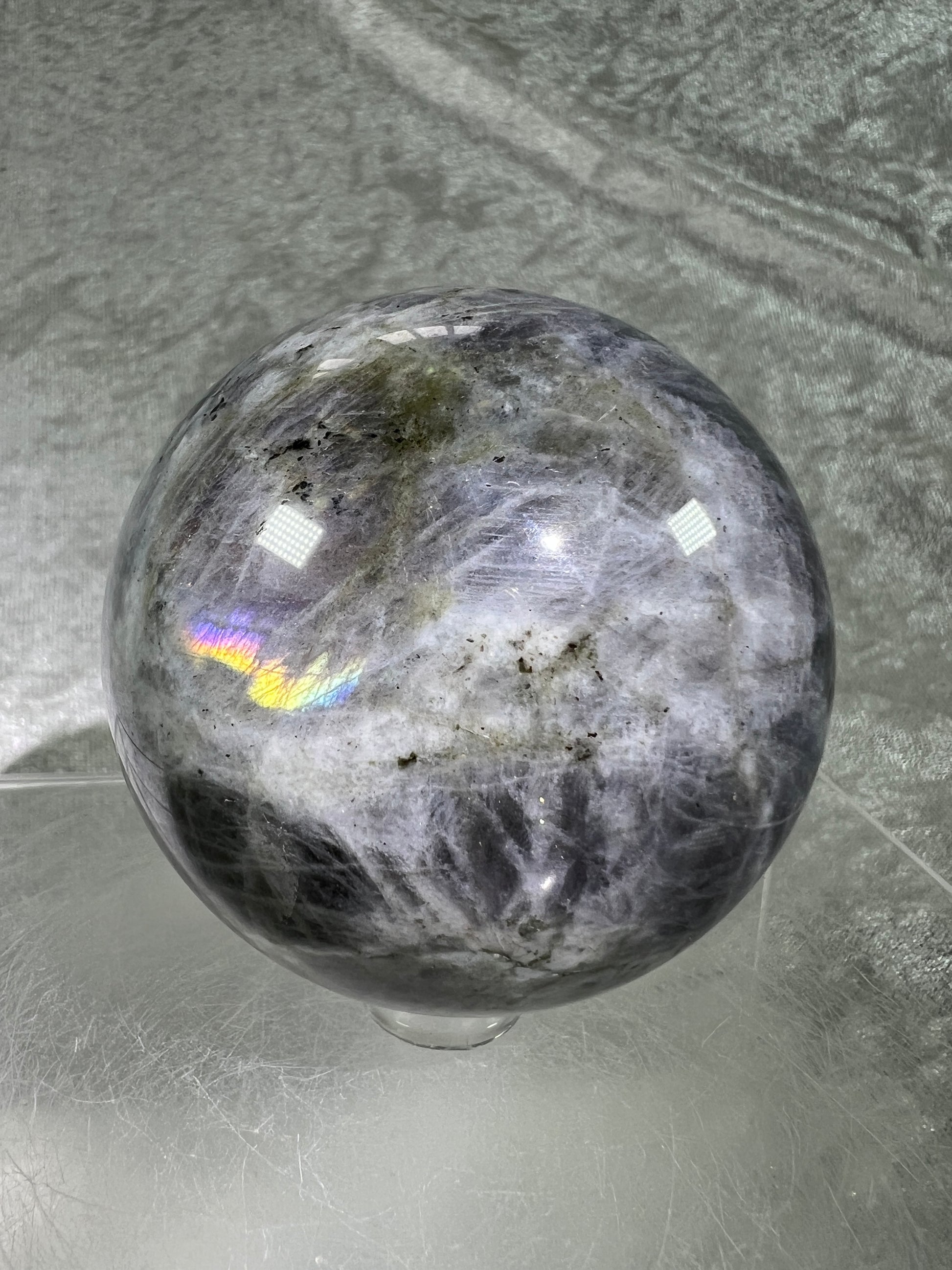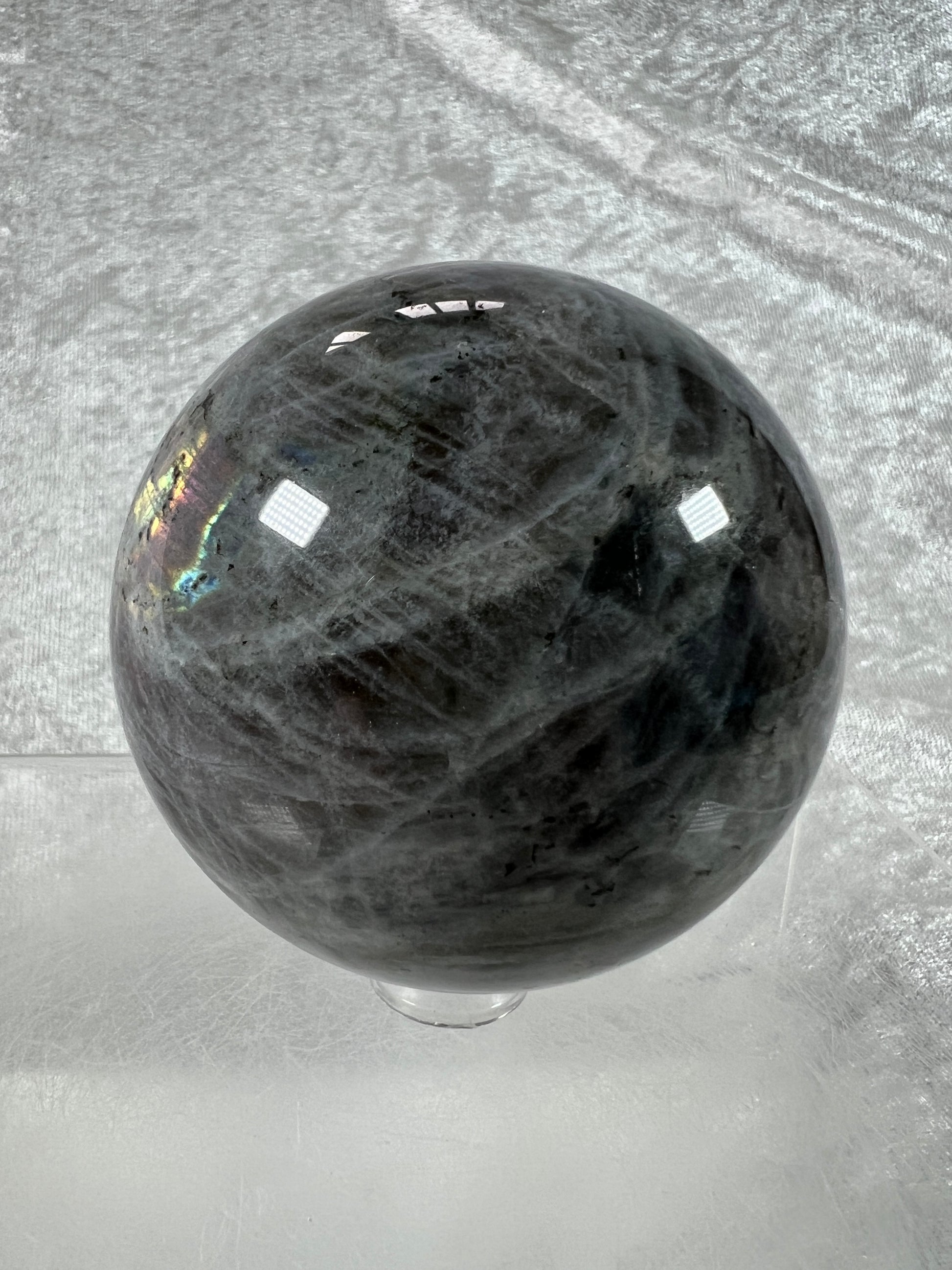 Labradorite Crystal Sphere. 66mm. Very Rare Rainbow Flash With Purple, Pink, Yellow, Orange, And Blue. Amazing Sphere!