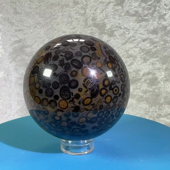 Enhance your crystal collection with our stunning Leopardskin Jasper Sphere. With its high quality and rare colors, this sphere showcases beautiful and realistic patterns that make it a must-have for any display. Bring a touch of uniqueness and elegance to your space with this eye-catching crystal.