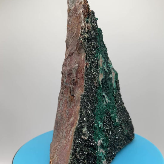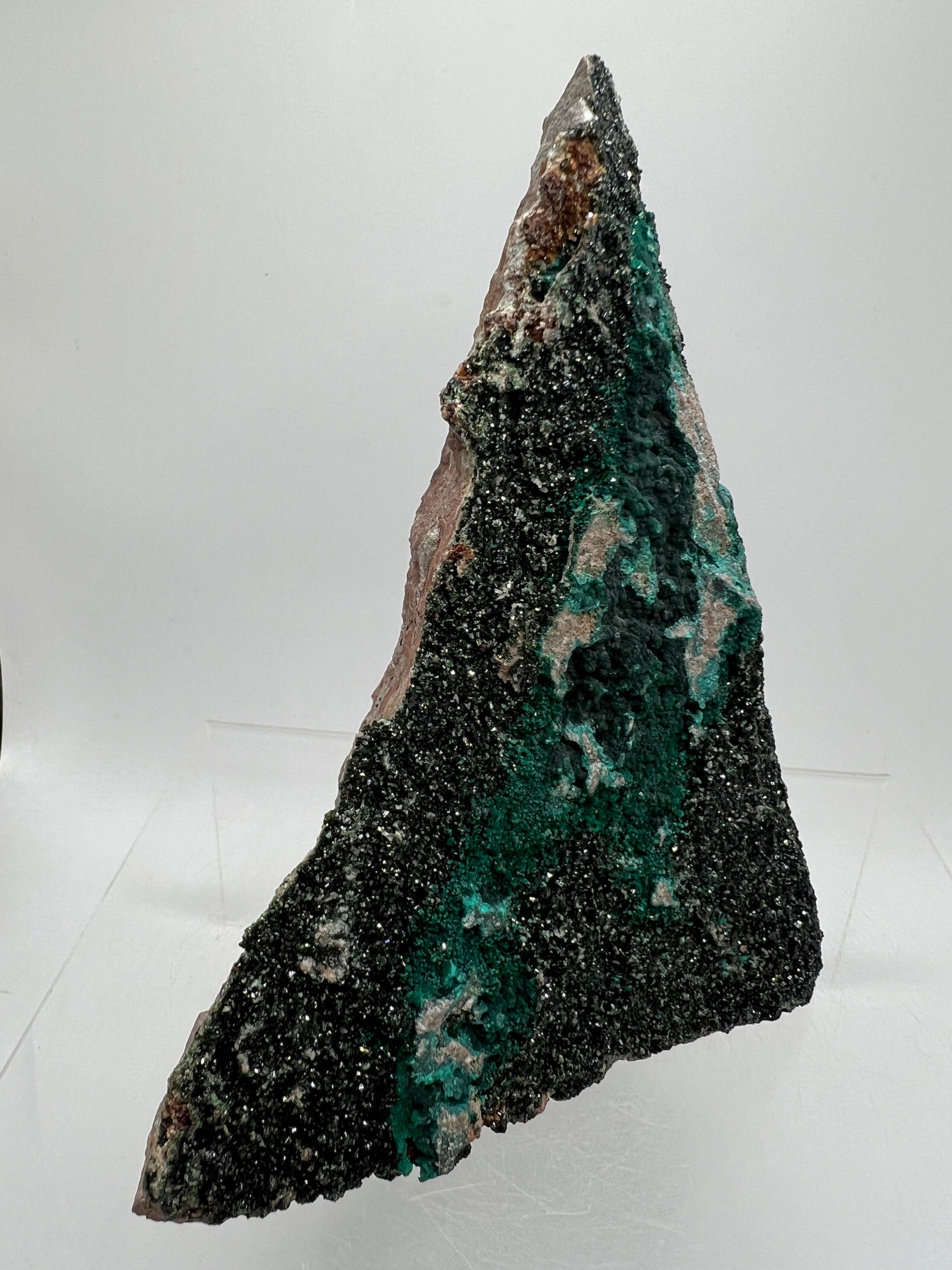 This large Libethenite specimen features spots of Malachite and Chrysocolla. Very high quality mixed mineral display specimen.