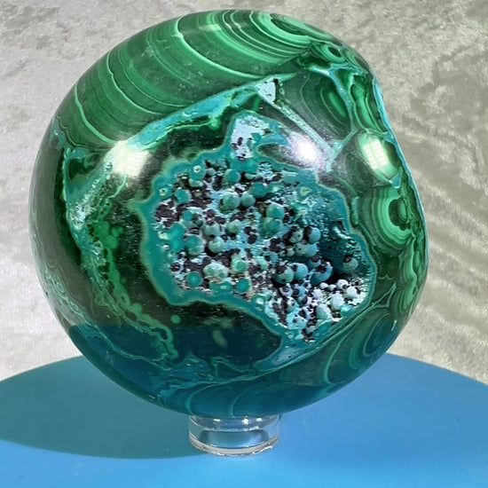 "Add a pop of color to your collection with this rare large Malachite and Druzy Chrysocolla sphere. High quality and featuring amazing patterns, this piece is perfect for any collector looking for vibrant and unique additions. Don't miss out on this gorgeous and one-of-a-kind find!"