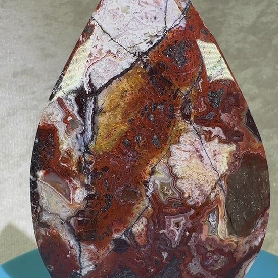 Discover the beauty and energy of Mexican Crazy Lace Agate with our High Quality Polished Freeform Flame. This stunning flame-shaped crystal features unique patterns and intricate druzy formations, making it a one-of-a-kind addition to your crystal collection. Harness its vibrant energy for heightened creativity and positivity.