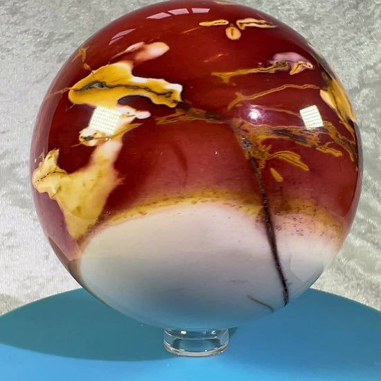 Enhance your crystal collection with our large Mookaite Crystal Sphere. Measuring at 77mm, this high-quality sphere boasts rare and striking colors of orange, red, and yellow. Perfect for collectors, its gorgeous appearance adds beauty to any space.