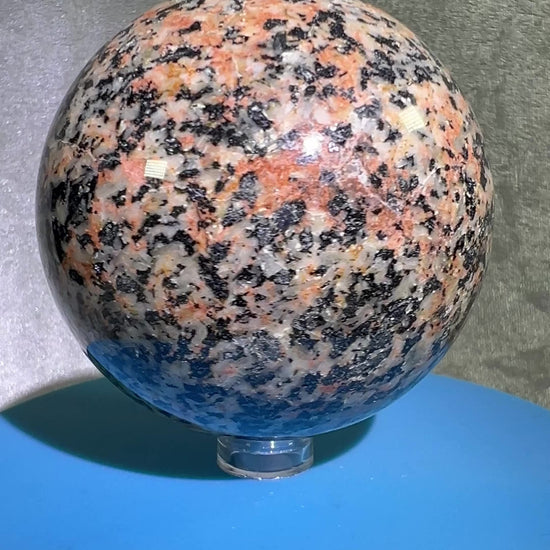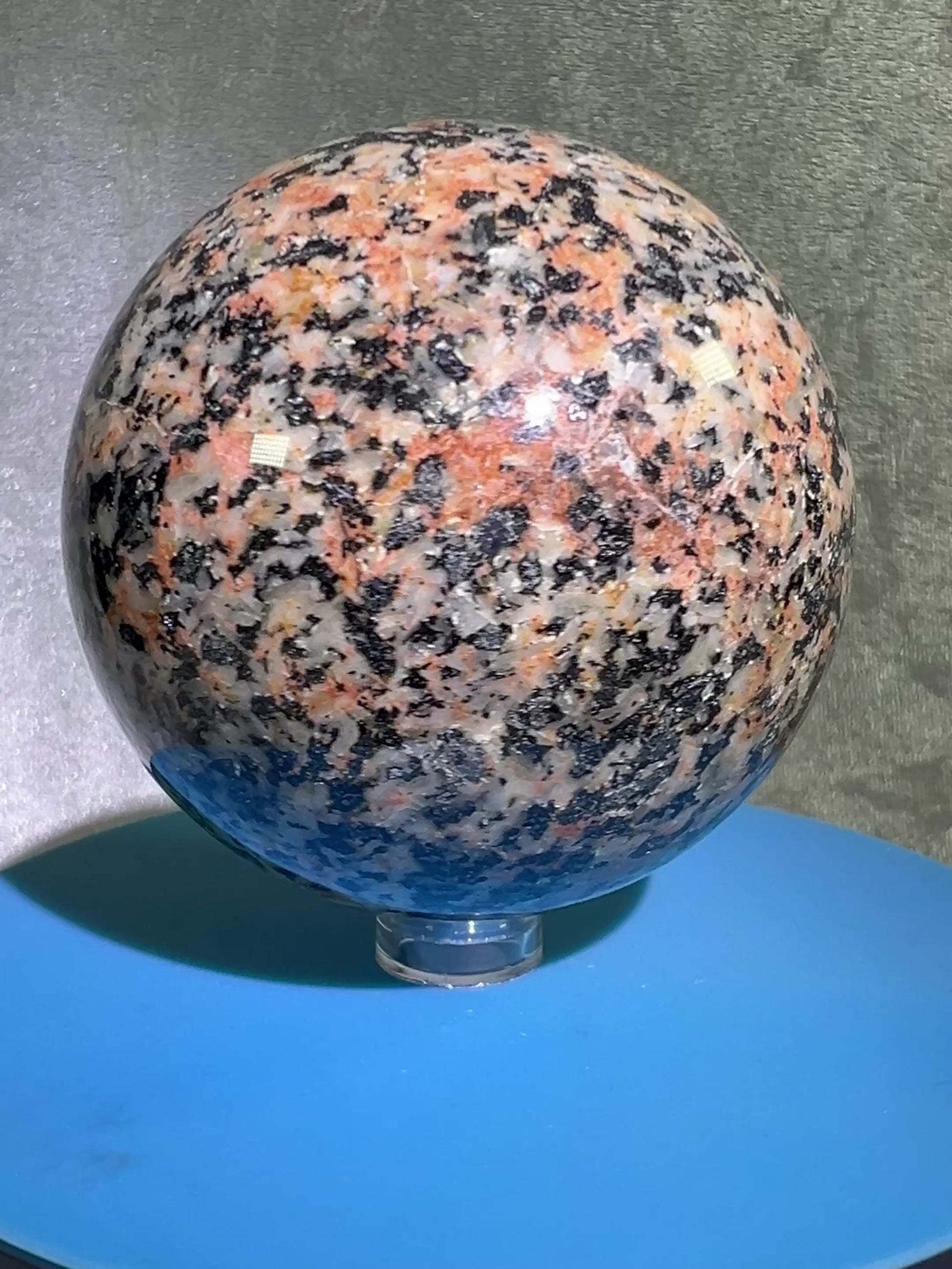 Beautiful rare crystal sphere from Peru. Gorgeous color combination with lots of flash. Morning Rose Granite is a mixture of orange/peach feldspar, black hornblende, milky quartz, and dark/golden sparkling grains of mica. High quality and unique crystal for your collection.