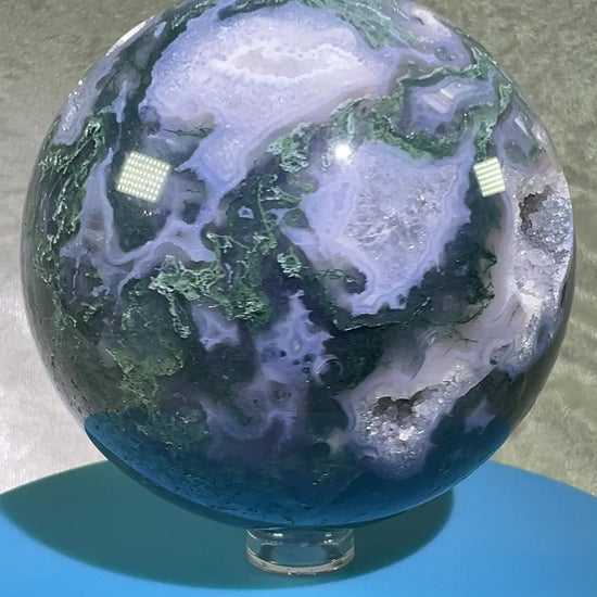 "Add some unique and playful vibes to your crystal collection with our amazing Moss Agate Sphere! Admire the rare blue colors and gorgeous patterns, including the stunning druzy. This high quality 77mm sphere is sure to catch eyes and spark conversation. Don't miss out on this one-of-a-kind find!"