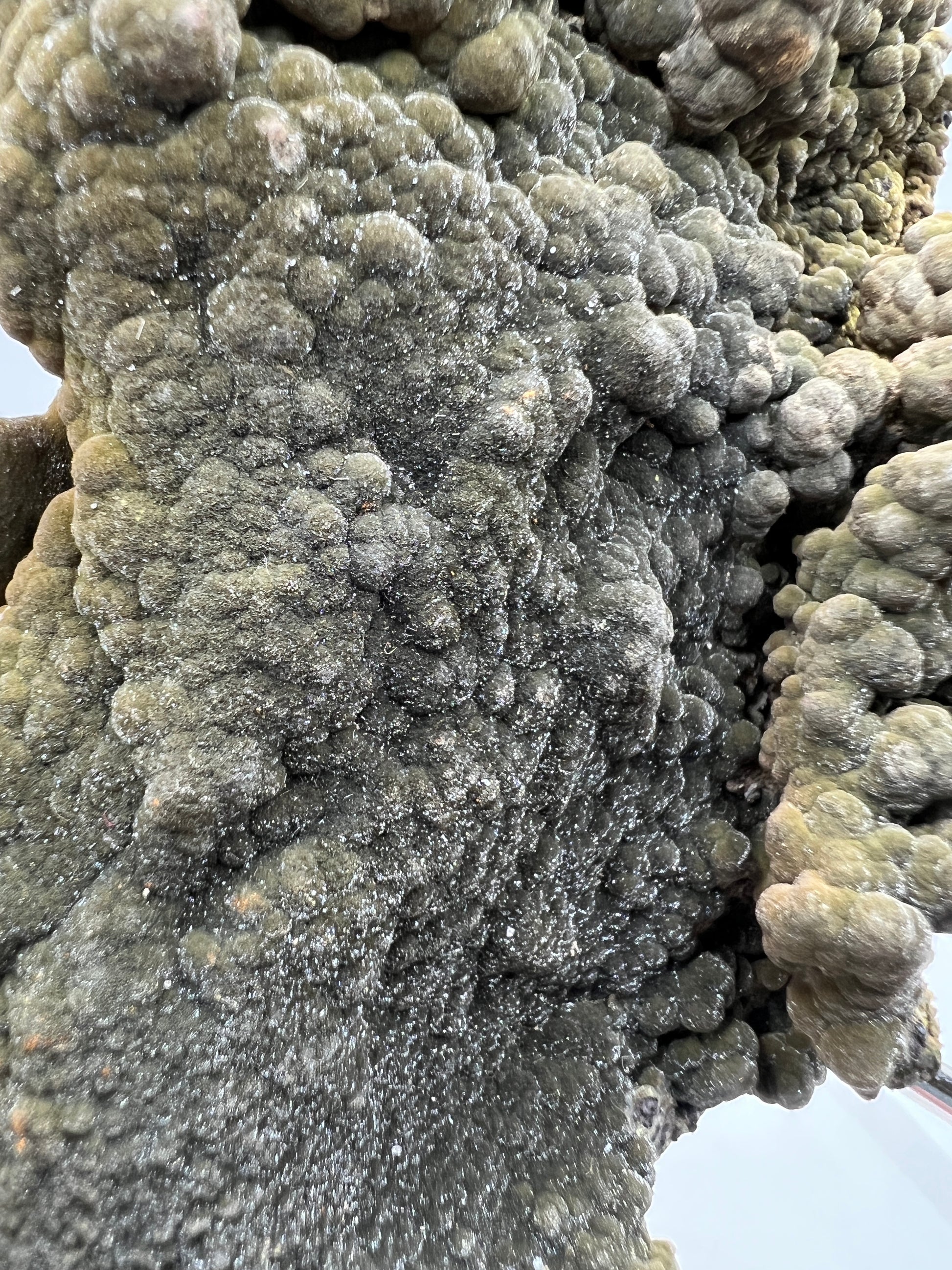 This amazing specimen is from the world famous 2011 discovery at the Ojuela Mine in Mapimi Durango Mexico. It was the only time that Mottramite has been discovered in Mexico and is considered to be the finest examples of Mottramite in the world. We have a very limited amount available for our crystal family, and this is the last of that discovery mined in 2011. Truly a must have for any collector. Stunning olive green botryoidal Mottramite. High quality rare mineral specimen from Mexico. Very nice specimen display stand is included.