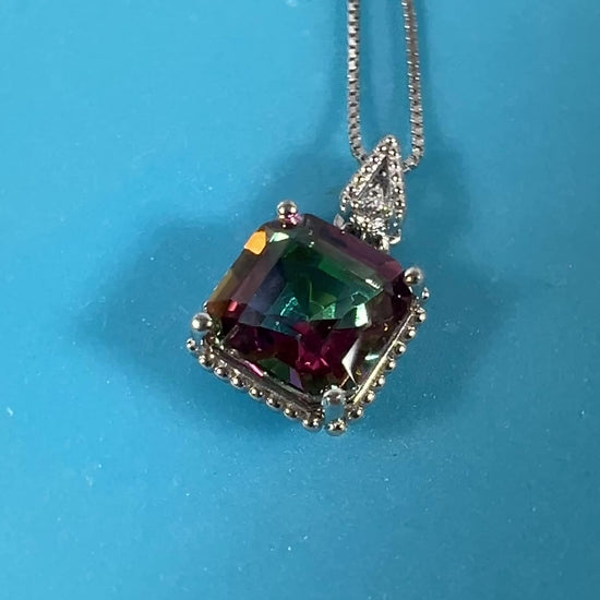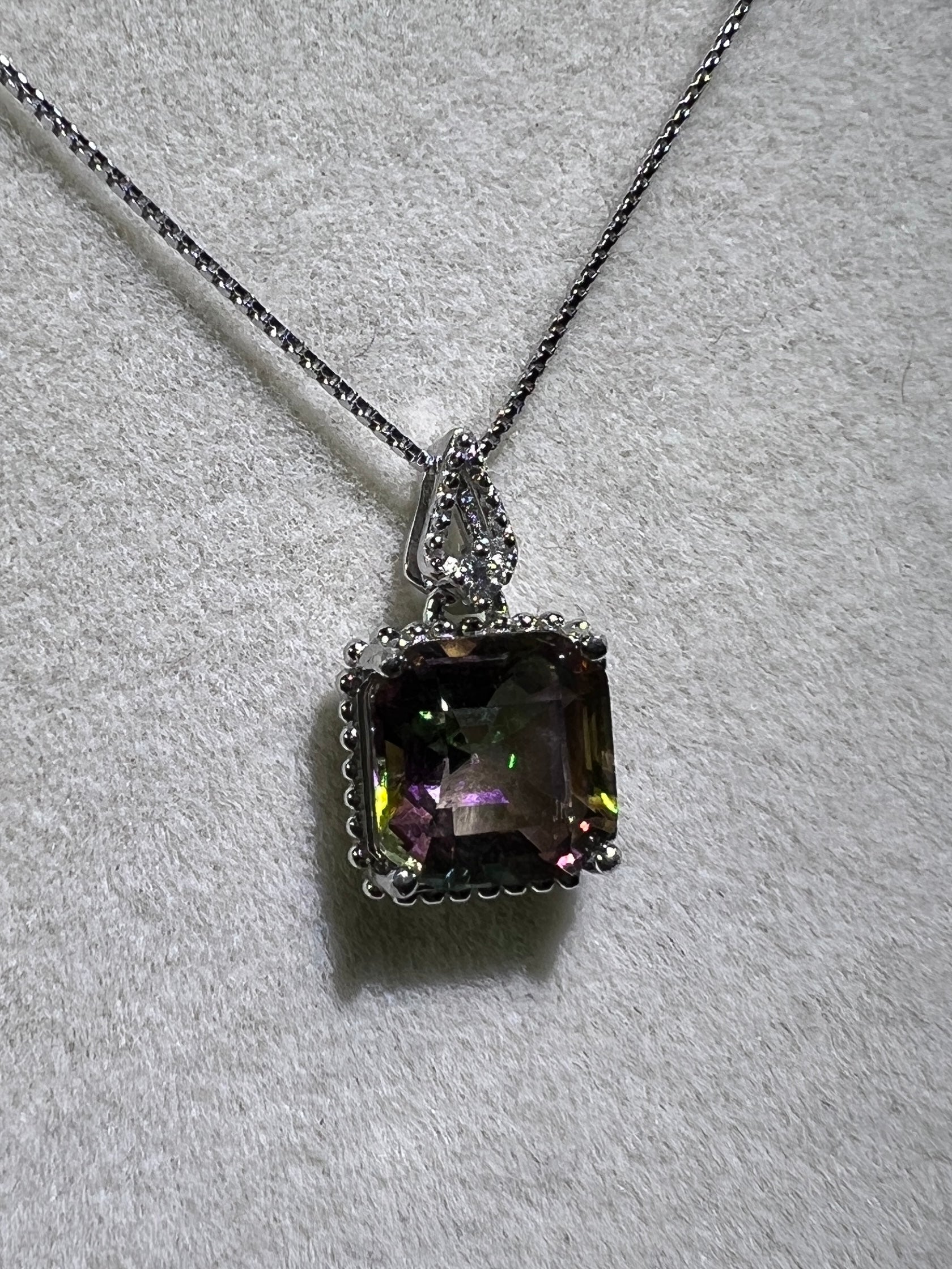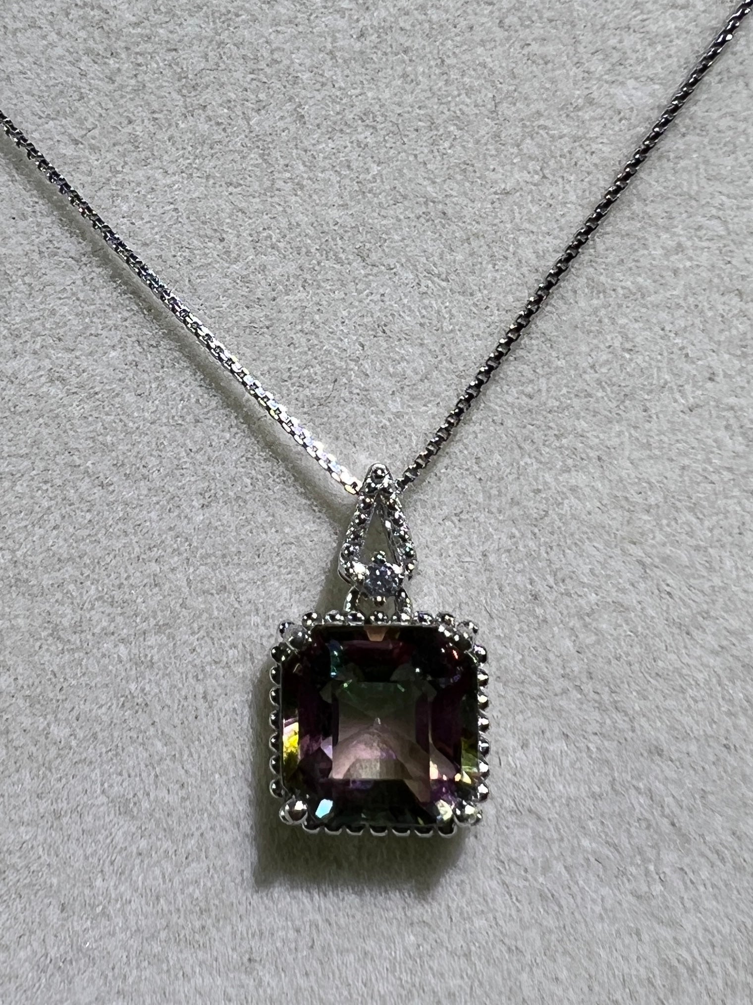 This is a stunning gemstone that is created by treating natural topaz with a special coating to give it a rainbow-like iridescence. Through a modern technology technique called CVD (chemical vapors disposition) the stone is made more desirable. The process places a thin layer of titanium onto a colorless topaz gemstone, resulting an eye-catching variety of colors. Amazing rainbow colors. Includes an 18 inch S925 silver box style necklace.