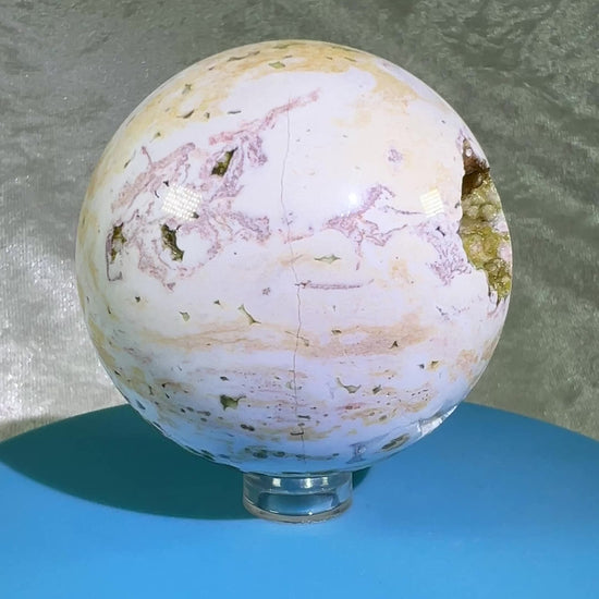 This Ocean Jasper Sphere from Madagascar is a stunning display crystal with rare and gorgeous colors. The sugar druzy sparkles from within, adding a unique touch. This high-quality crystal is perfect for any crystal enthusiast looking for a one-of-a-kind piece to add to their collection.