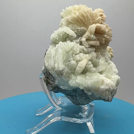 This stunning Prehnite specimen from Morocco boasts beautiful green crystal clusters, creating a gorgeous mineral display. Sourced from one of the world's leading locations for this mineral, this specimen is perfect for those seeking a unique addition to their collection. Clear small display stand is included.