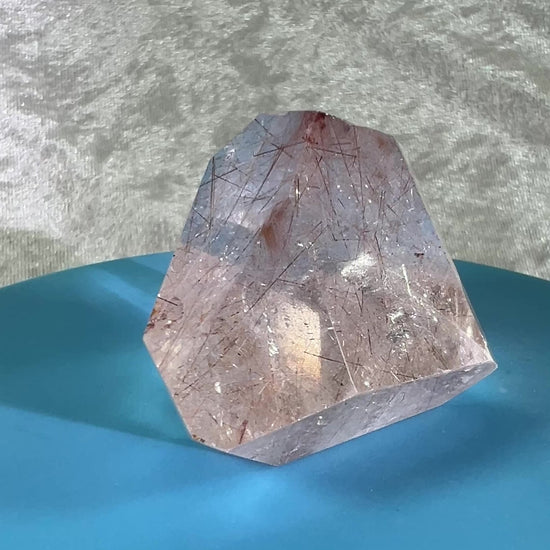 This Rutile Quartz Polished Freeform features stunning red and gold rutiles, giving it rare and eye-catching colors. Its unique rutile freeform shape adds to its beauty. Small natural chip on top. A must-have for any crystal collector, this piece is sure to impress.