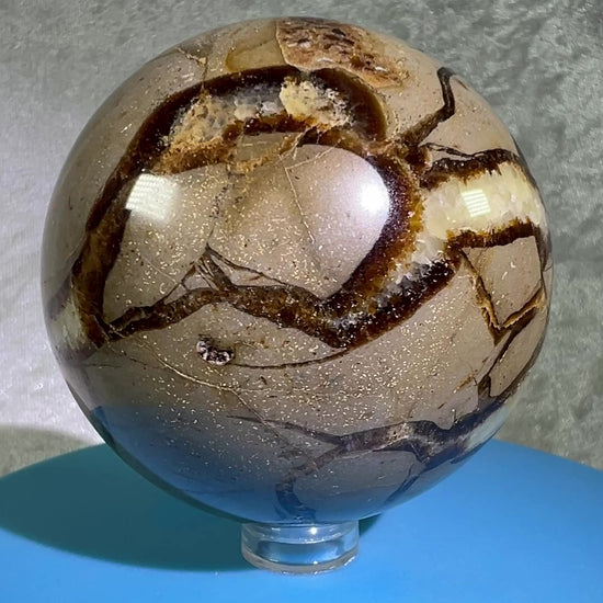 Unleash your inner dragon with this extraordinary Septarian crystal sphere from Mahajanga, Madagascar. The unique combination of aragonite, calcite, and limestone creates a stunning fossil nodule display, making it the perfect addition to any collection. Get ready to amaze your friends with this one-of-a-kind dragons egg crystal!