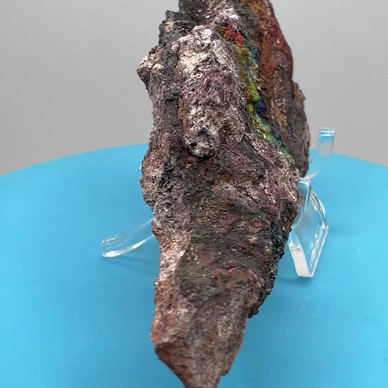 This Turgite specimen from Cocomorachic, Chihuahua, Mexico showcases the amazing iridescent rainbow flash of hematite and goethite minerals. A stunning addition to any collection, this piece is a true testament to the beauty and diversity of the natural world. Clear small display stand is included.