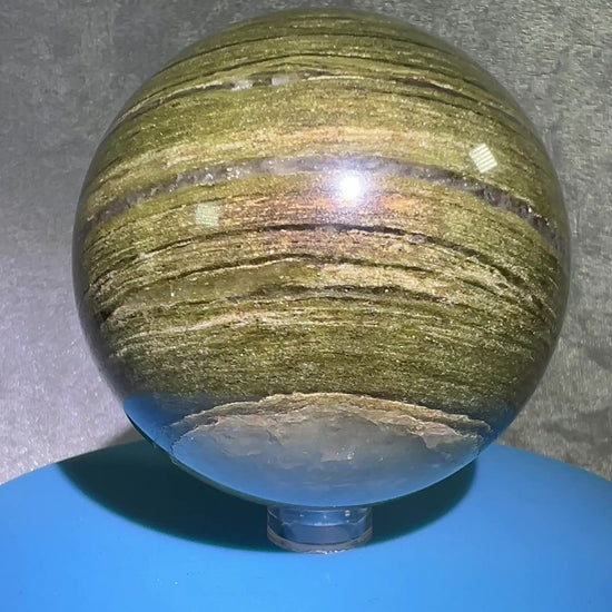 Enhance your crystal collection with our stunning Vesuvianite Crystal Sphere. Measuring 71mm, this high quality Idocrase Display Sphere showcases gorgeous banding and unique patterns. Add a touch of beauty and positive energy to your space with this incredible crystal.