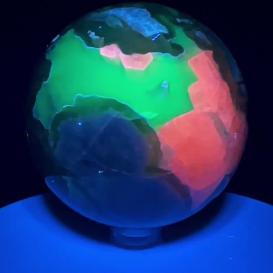 This Volcano Agate with Mangano Calcite Sphere is a rare and stunning piece that displays a beautiful combination of green and orange uv colors. Its high quality and intense UV reaction make it a perfect addition to any collection. Don't miss out on this amazing display sphere.
