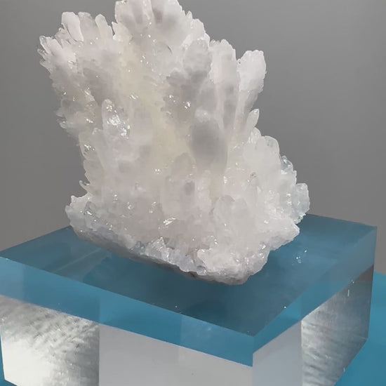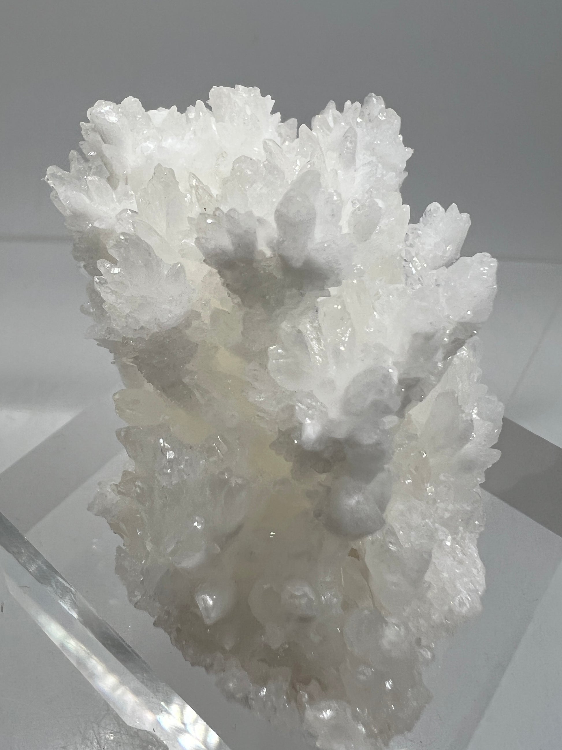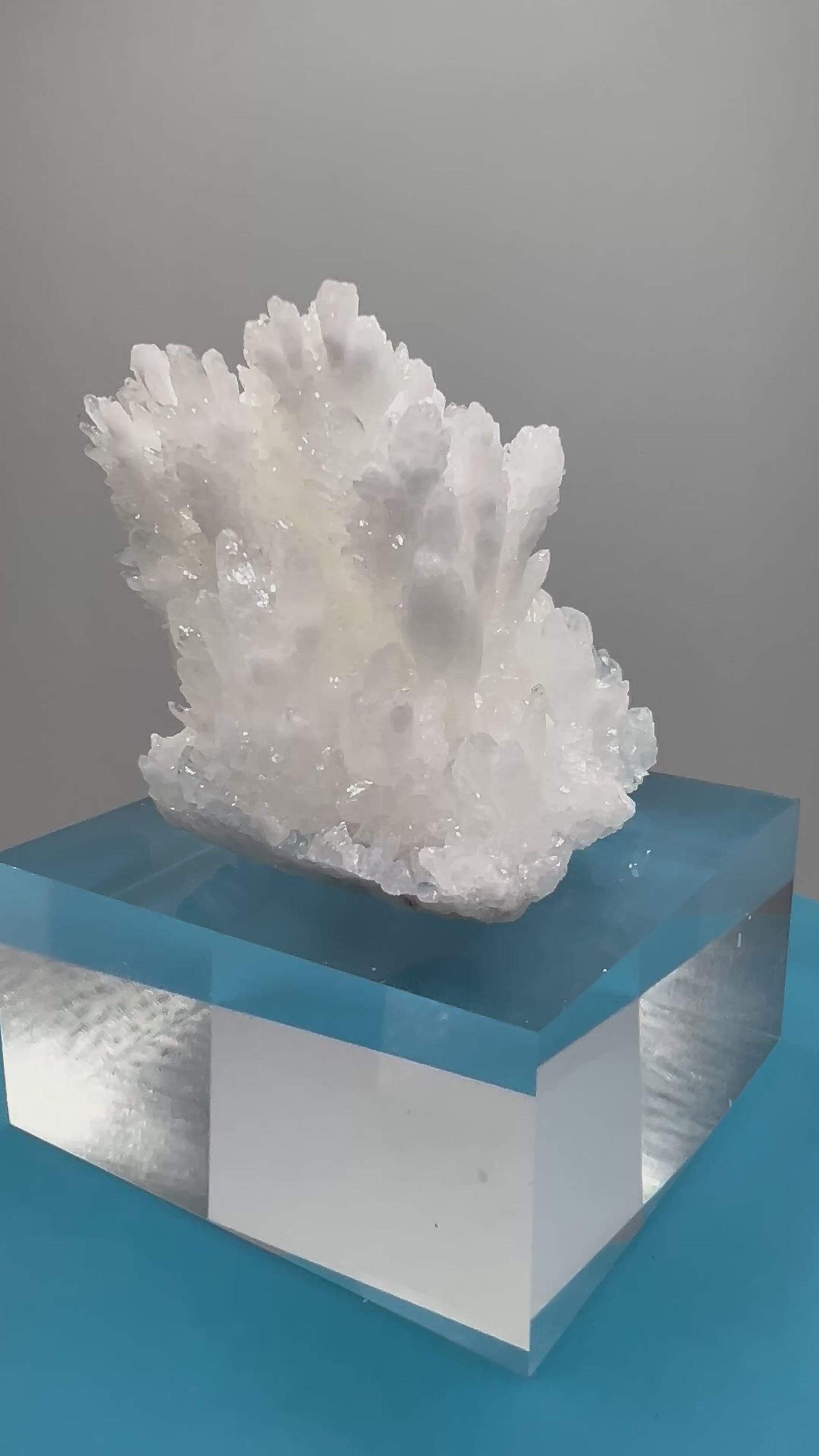 This premium White Aragonite Crystal Specimen is sourced from the renowned Chihuahua region in Mexico. This piece showcases the beautiful formations of cave calcite, making it a unique addition to any collection. With high quality and purity, this specimen is a must-have for any crystal enthusiast. Clear acrylic display base is included.