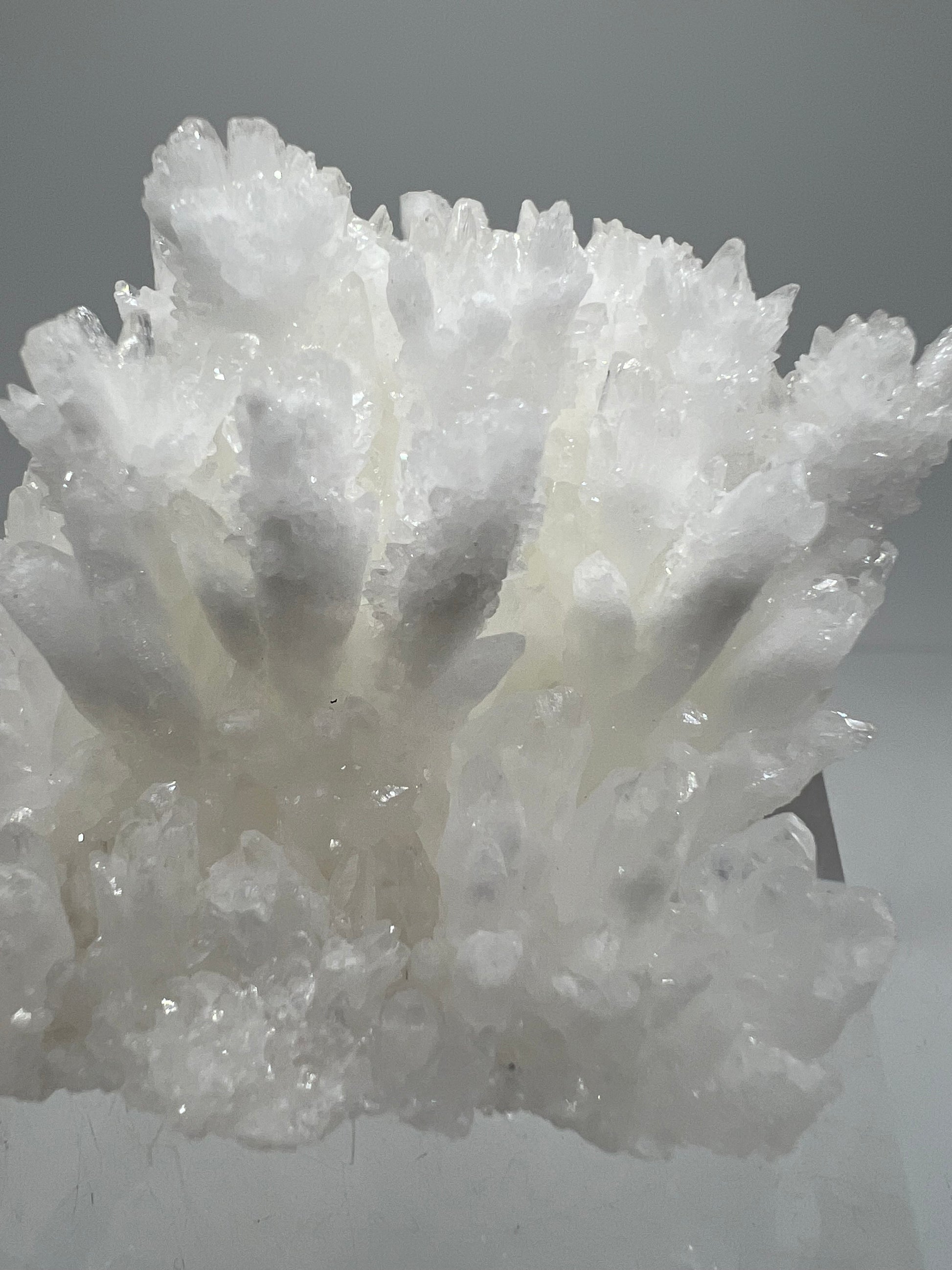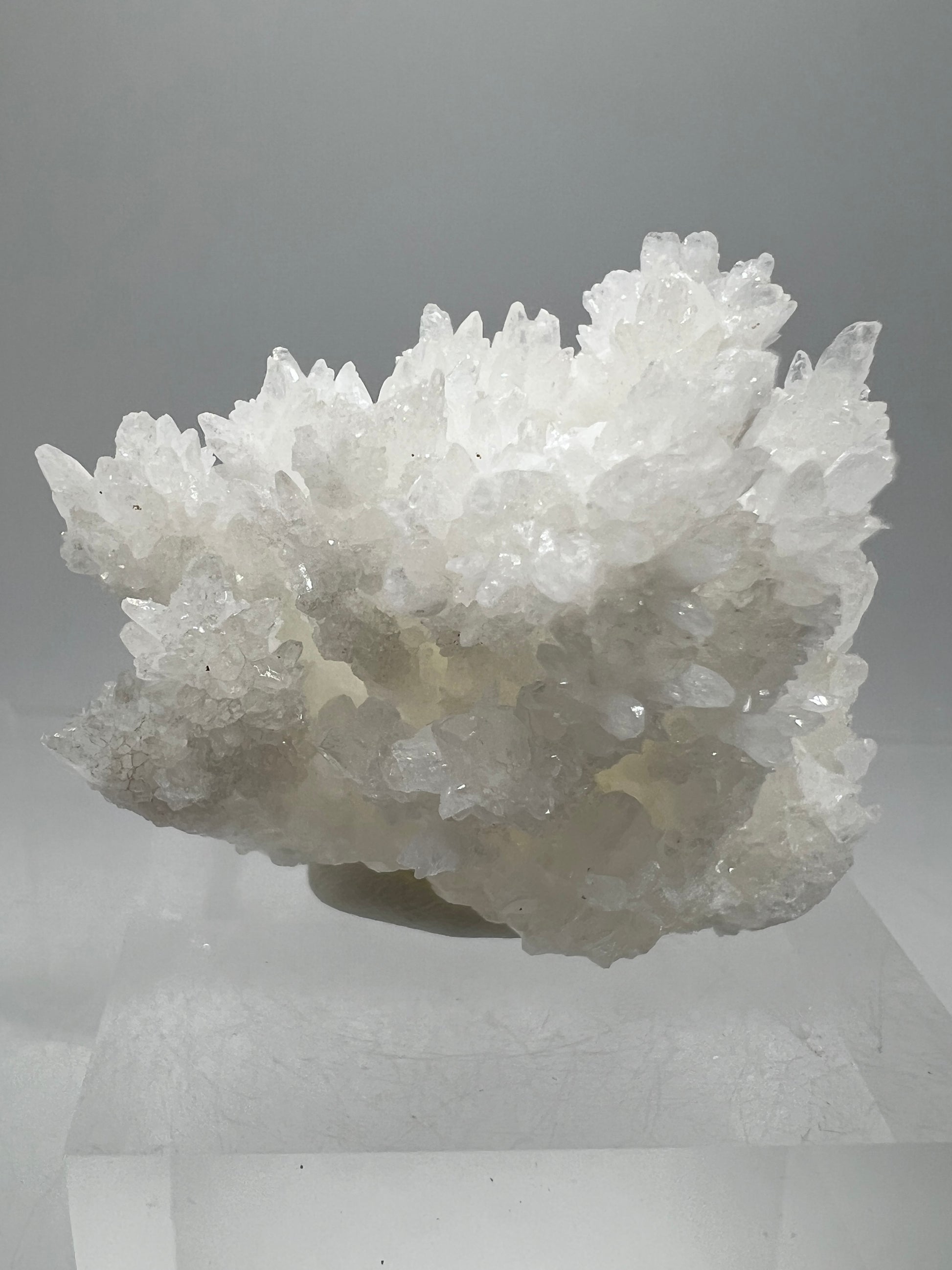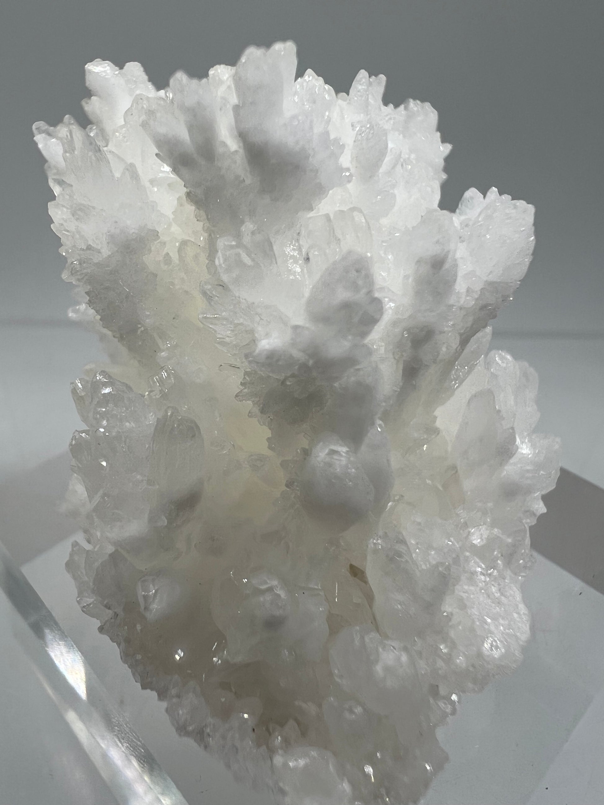 This premium White Aragonite Crystal Specimen is sourced from the renowned Chihuahua region in Mexico. This piece showcases the beautiful formations of cave calcite, making it a unique addition to any collection. With high quality and purity, this specimen is a must-have for any crystal enthusiast. Clear acrylic display base is included.