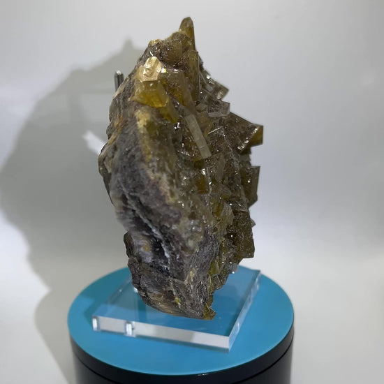 Discover the rare beauty of this exquisite Golden Yellow Barite on a Fluorite Matrix. Mined from the Xiefang Mine in Jiangxi Province, China, this stunning piece boasts a vibrant golden hue that will add a touch of elegance to any collection. Don't miss out on this extraordinary find.