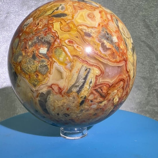 This stunning large Yellow Crazy Lace Agate Sphere boasts intricate patterns and exquisite colors, making it a rare and beautiful addition to any collection. Sourced from Indonesia, this sphere's excellent craftsmanship and unique features are sure to impress even the most discerning of collectors.